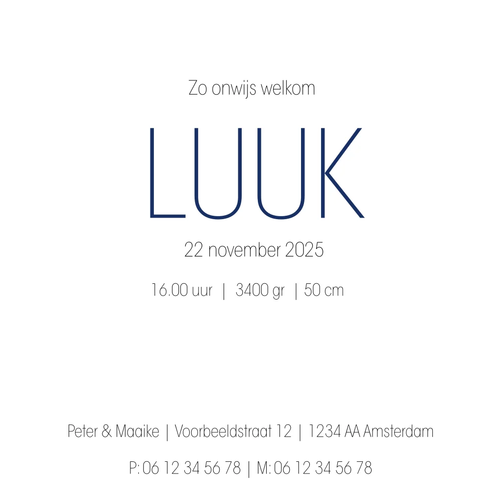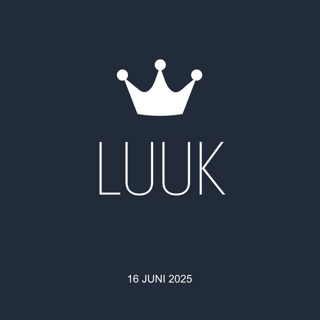 Stoer donkerblauw geboortekaartje voor een jongen met zilverfolie kroontje en de naam en datum ook. Wist je dat donkerblauw helemaal de kleur is voor jongens geboortekaartjes op dit moment?