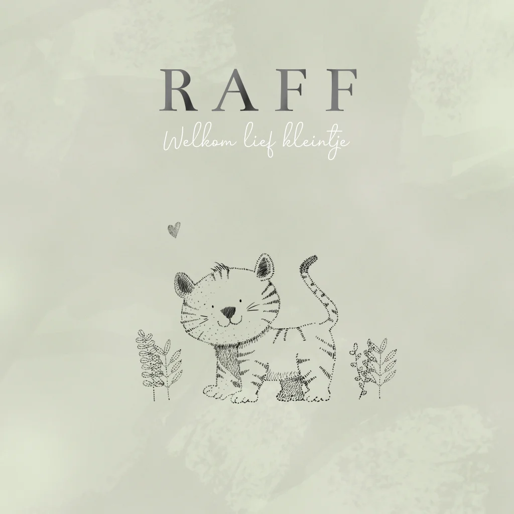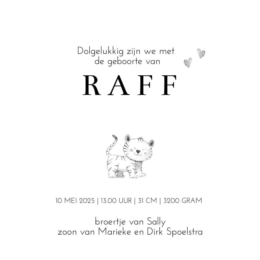 Dit is een stoer geboortekaartje voor jullie zoontje. Midden op de kaart staat de tekening van een tijgertje. Ook zijn er een aantal takjes en een hartje te zien. Pas het kaartje naar wens aan in de online editor en bestel een proefdruk om dit kaartje in het echt te zien.