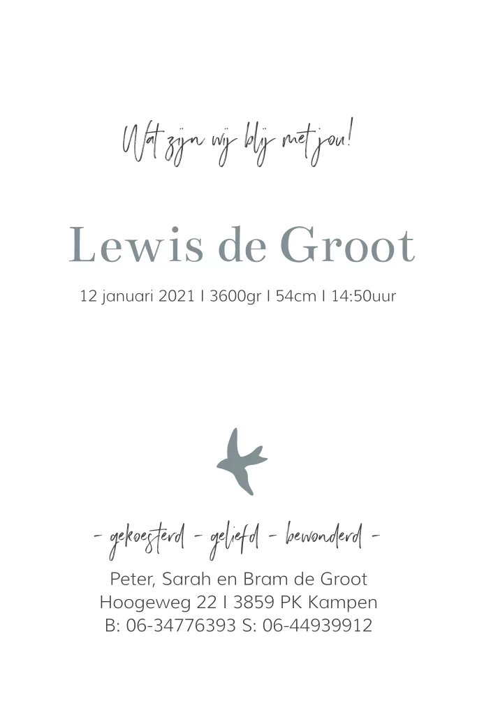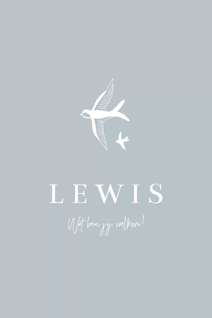Op dit hippe geboortekaartje staan een zwaluw met jong en de naam van jullie zoon gedrukt in goudfolie. Het kaartje heeft een blauw grijze achtergrond die mooi kleurt bij het goud. Liever andere kleuren? Deze pas je gemakkelijk aan in de online editor.
