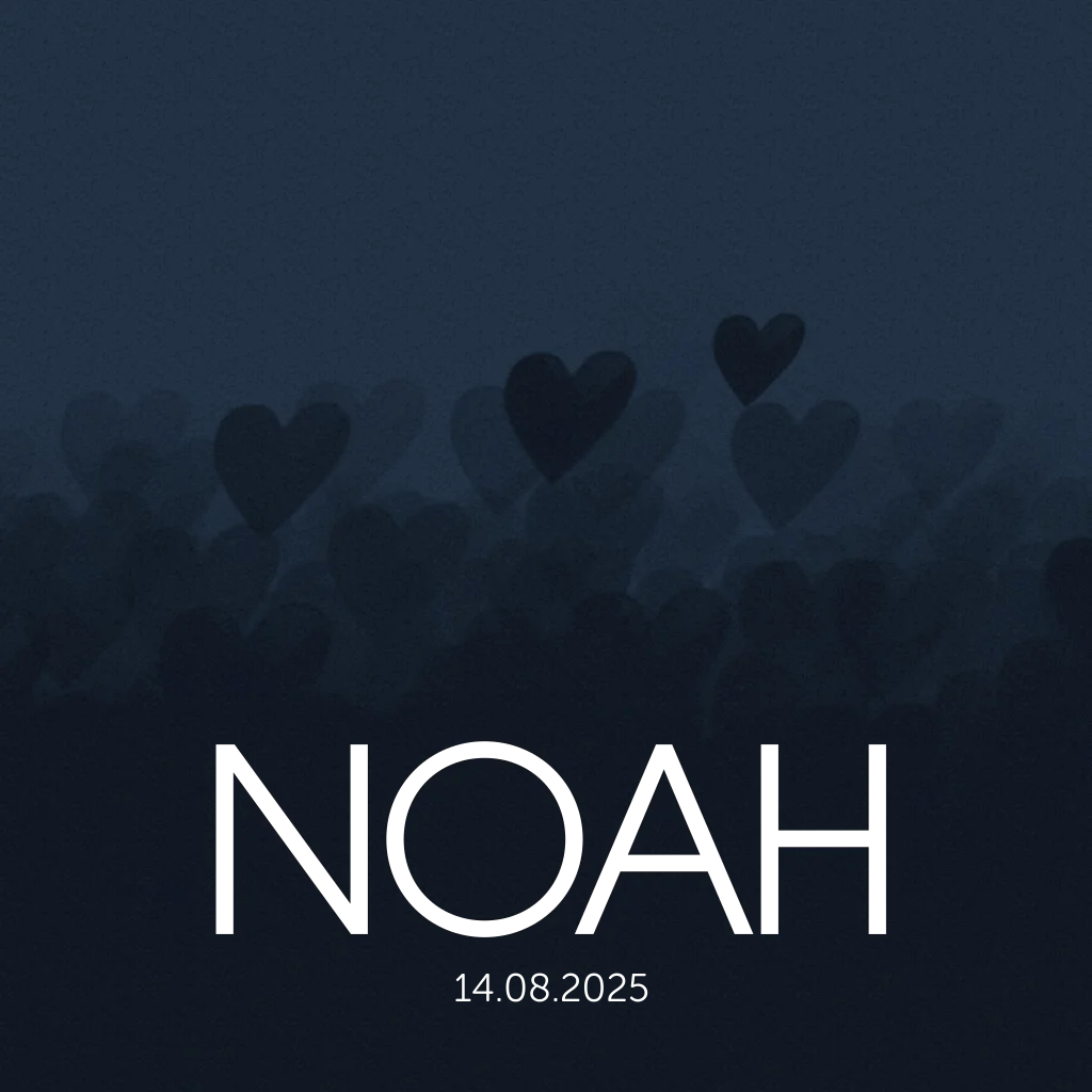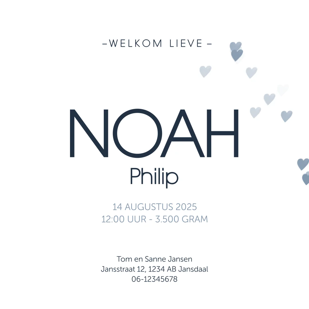Stijlvol geboortekaartje voor je zoontje met een donkerblauwe achtergrond waarin je blauwe hartjes kunt zien. De babynaam op de voorkant wordt in goudfolie gedrukt en maakt dit kaartje heel erg chique! Hebben jullie al een naam voor je zoon bedacht?