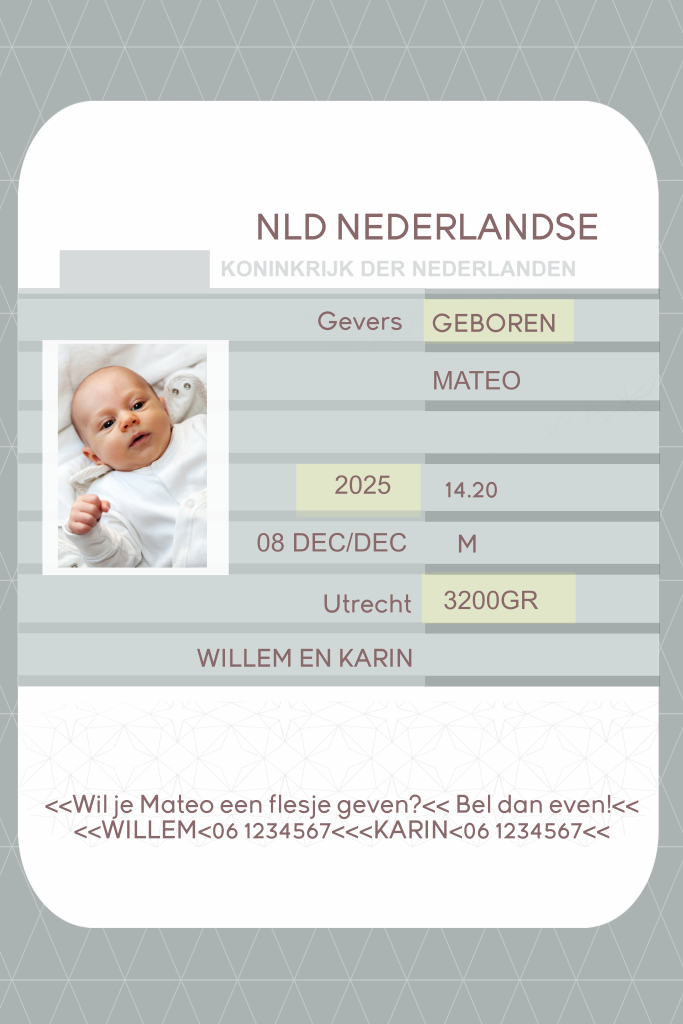Een trendy geboortekaart voor een jongetje met een goudfolie wereldbol en ooievaar. Het kaartje is in de stijl van een paspoort.