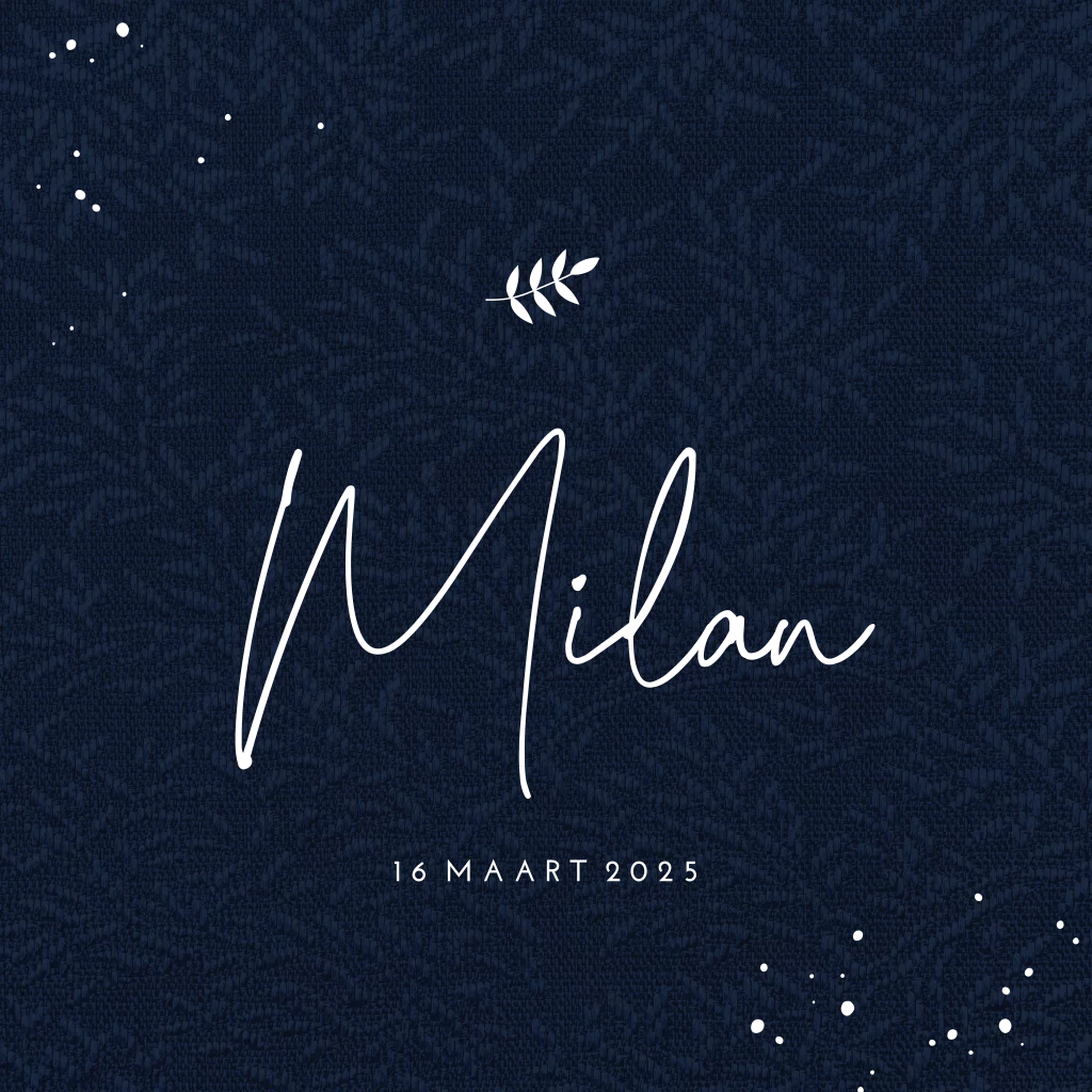 Donkerblauw geboortekaartje met goudfolie, takjespatroon en stof-look