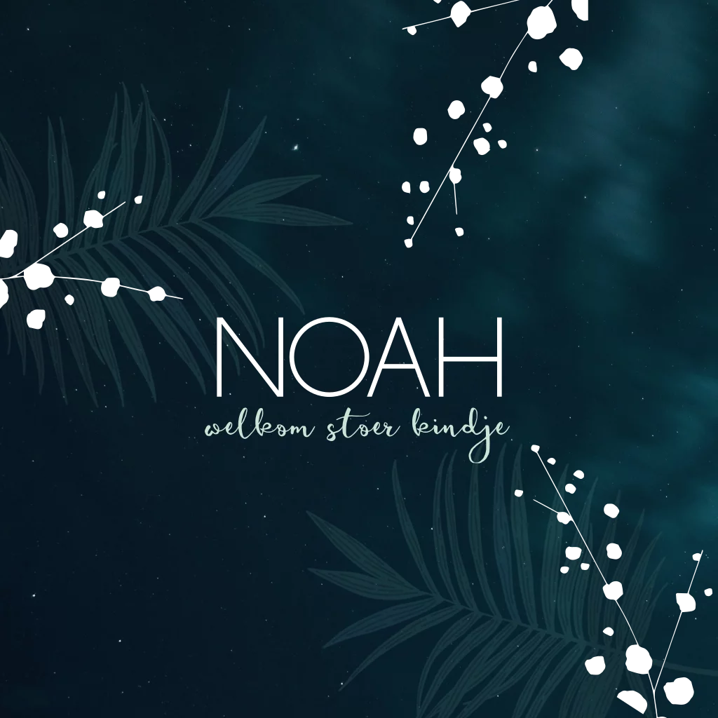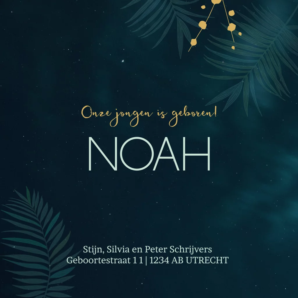 Stijlvol geboortekaartje voor je zoontje die helemaal past in de jungle trend. De goudfolie takjes op de donkerblauwe achtergrond met botanische bladeren maakt dit echt een chique geboortekaartje!