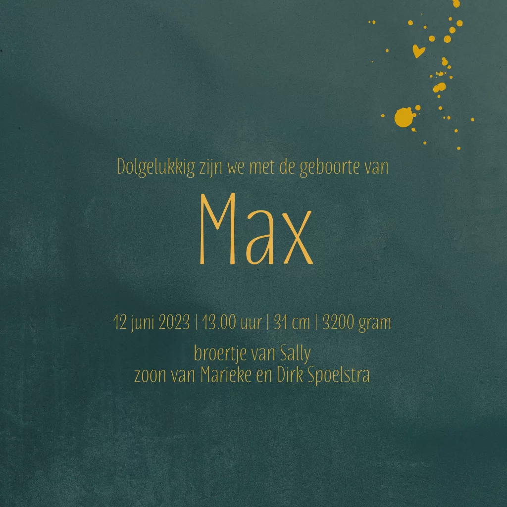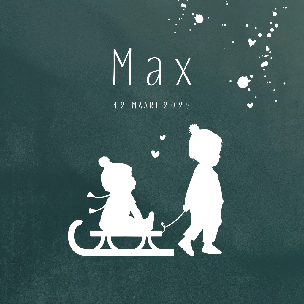 Krijgen jullie een tweede kindje? Op dit lieve winterse kaartje staat het silhouetje van een grote broer met klein broertje op de slee. Het silhouet, de naam van jullie zoontje en de verf spetters worden gedrukt in goudfolie. De donkergroene achtergrond geeft het kaartje een warme uitstraling.