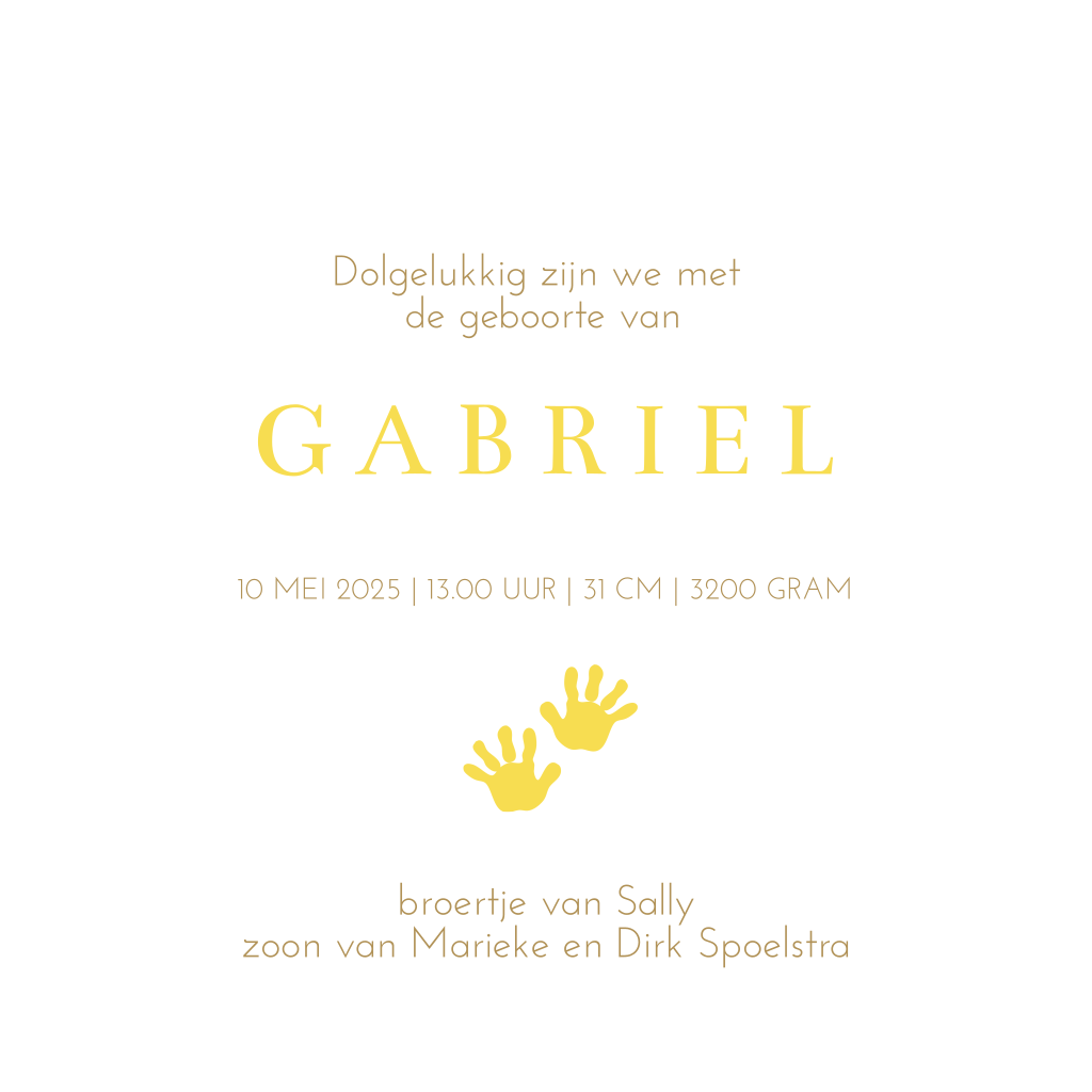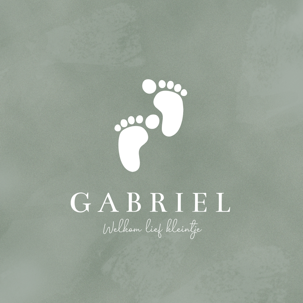 Hip geboortekaartje met het silhouet van babyvoetjes en de naam van jullie zoon in goudfolie. Het kaartje heeft een trendy velvet-look achtergrond in het groen. Samen met het goudfolie geeft dat een warme uitstraling. Bewerk dit kaartje naar wens in de online editor.