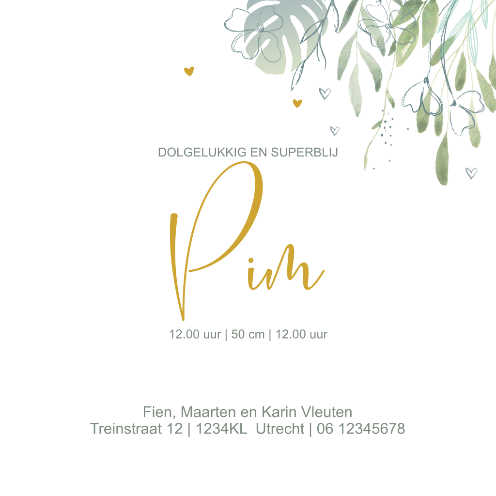 Vrolijk en stijlvol geboortekaartje voor jongen met stijlvolle takjes, romantische bloemen en de babynaam in goudfolie.