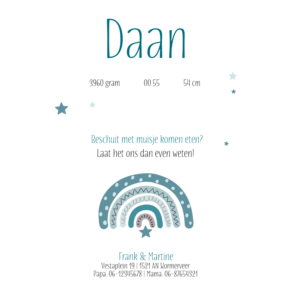 TIP: Het houten vormpje op dit kaartje wordt niet afgedrukt, deze is ter voorbeeld. Op die plek kun je straks zelf het échte houten vormpje plakken. Bij je proefdruk kun je een sample-set bestellen voor maar €1,49 met alle houten vormpjes erin. Zo kun je goed kijken welke het beste bij je geboortekaartje past. Bestel hier je sample-set.