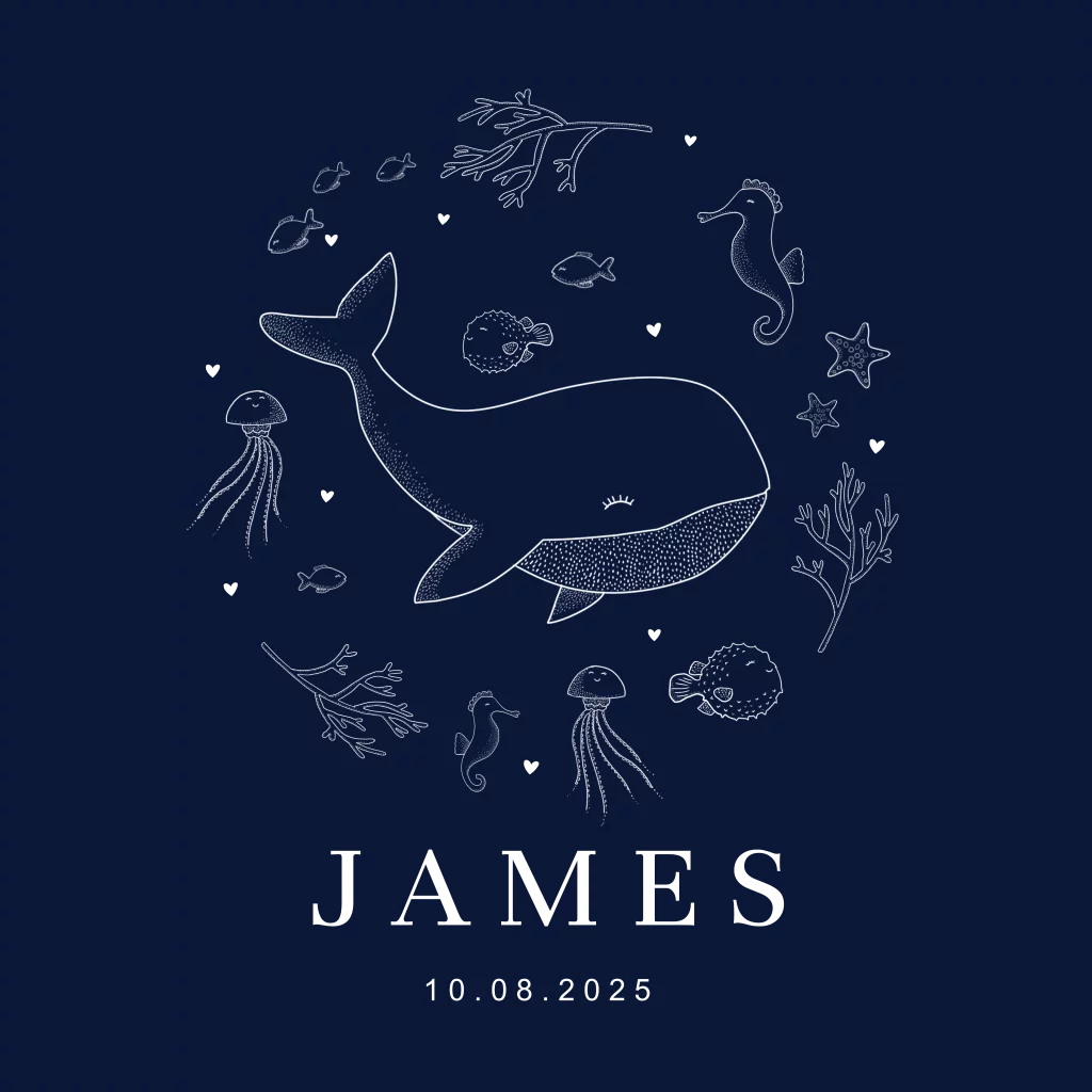 Stoer en trendy geboortekaartje voor je zoontje met goudfolie en hippe illustraties van een walvis en andere zeedieren op donkerblauw.