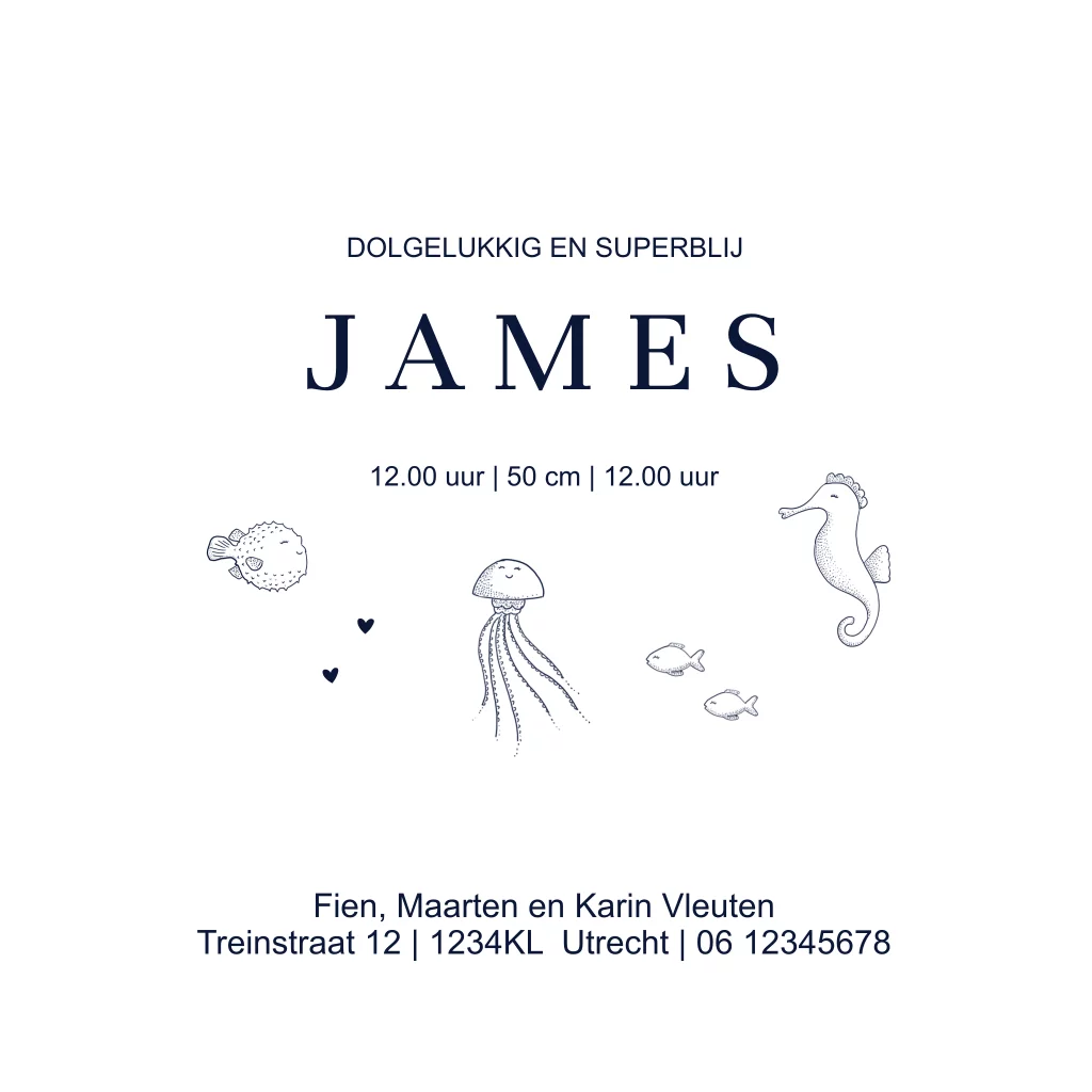 Hip goudfolie geboortekaartje voor jongen met zeedieren op donkerblauw