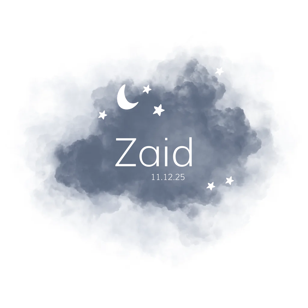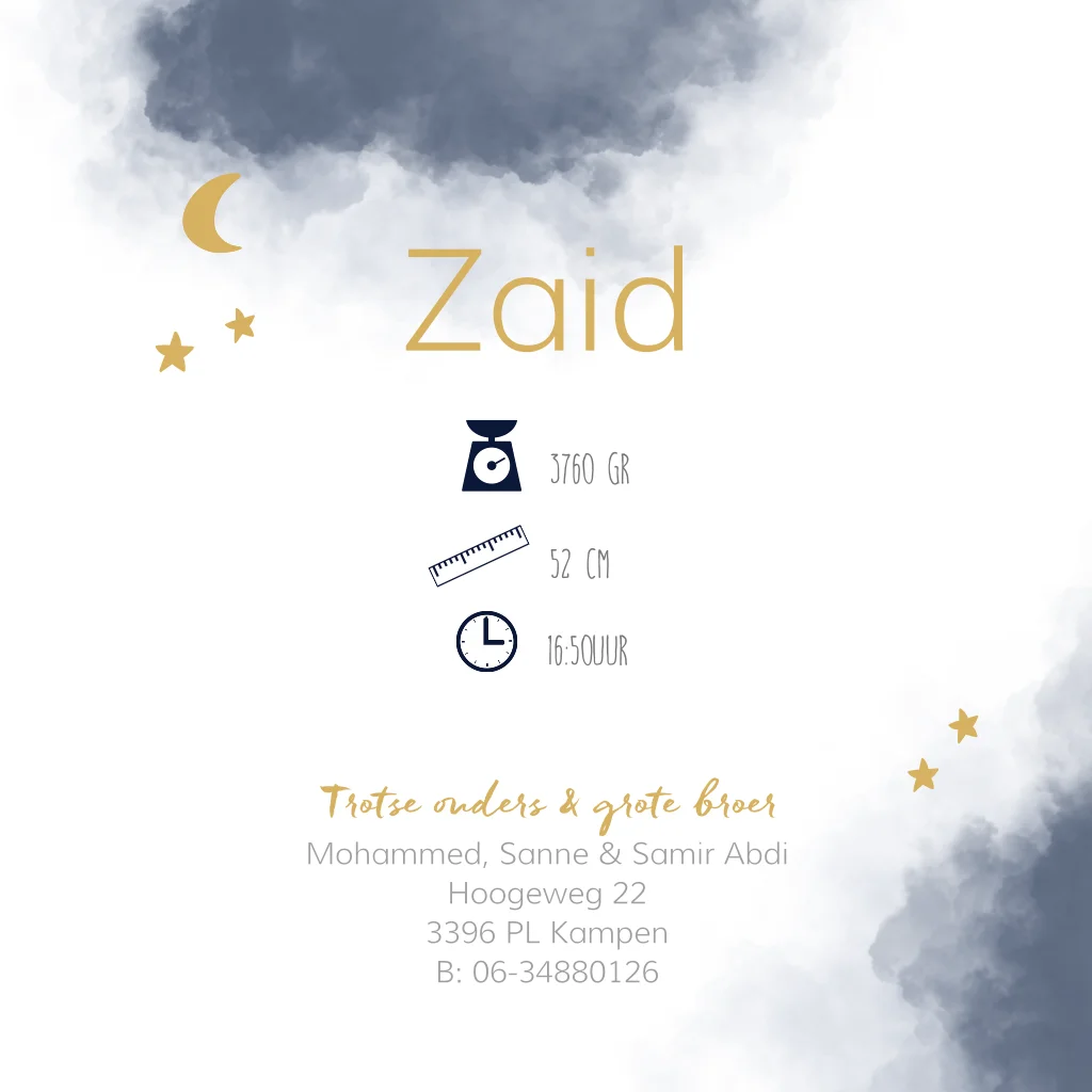 Hip geboortekaartje voor je pasgeboren zoon met stoere waterverf wolk en goudfolie maan en sterretjes. Verander de achtergrondkleur, de kleur van de aquarel verf of kies zilver of koperfolie en maak een unieke geboortekaart!