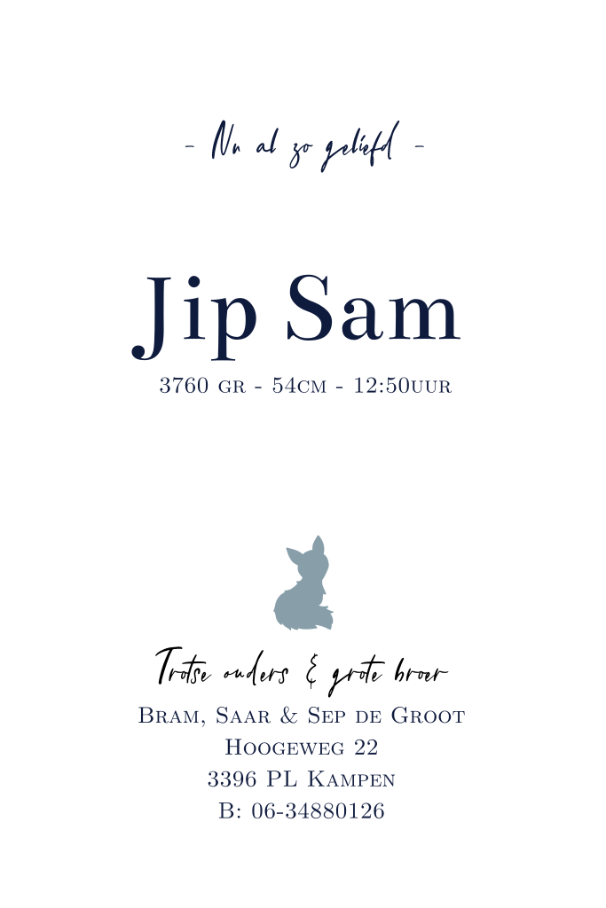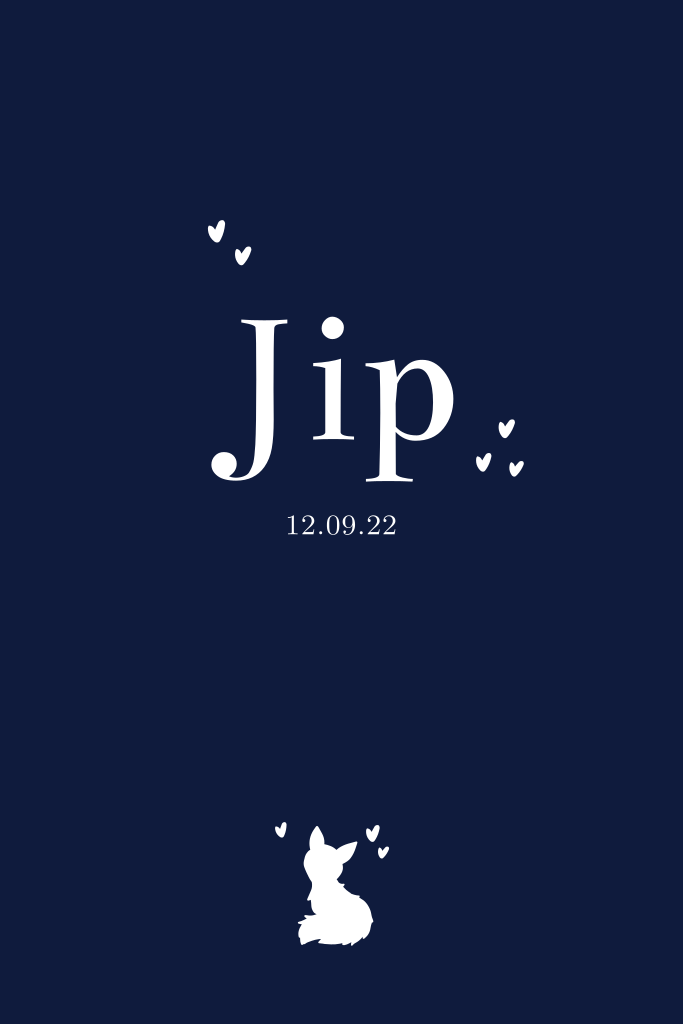 Dit hippe geboortekaartje heeft iets stoers en iets liefs. Op het donkerblauwe kaartje staan het silhouet van een vos en kleine hartjes in goudfolie. De blauwe achtergrond en kleur van het folie kun je eventueel veranderen in de online editor.