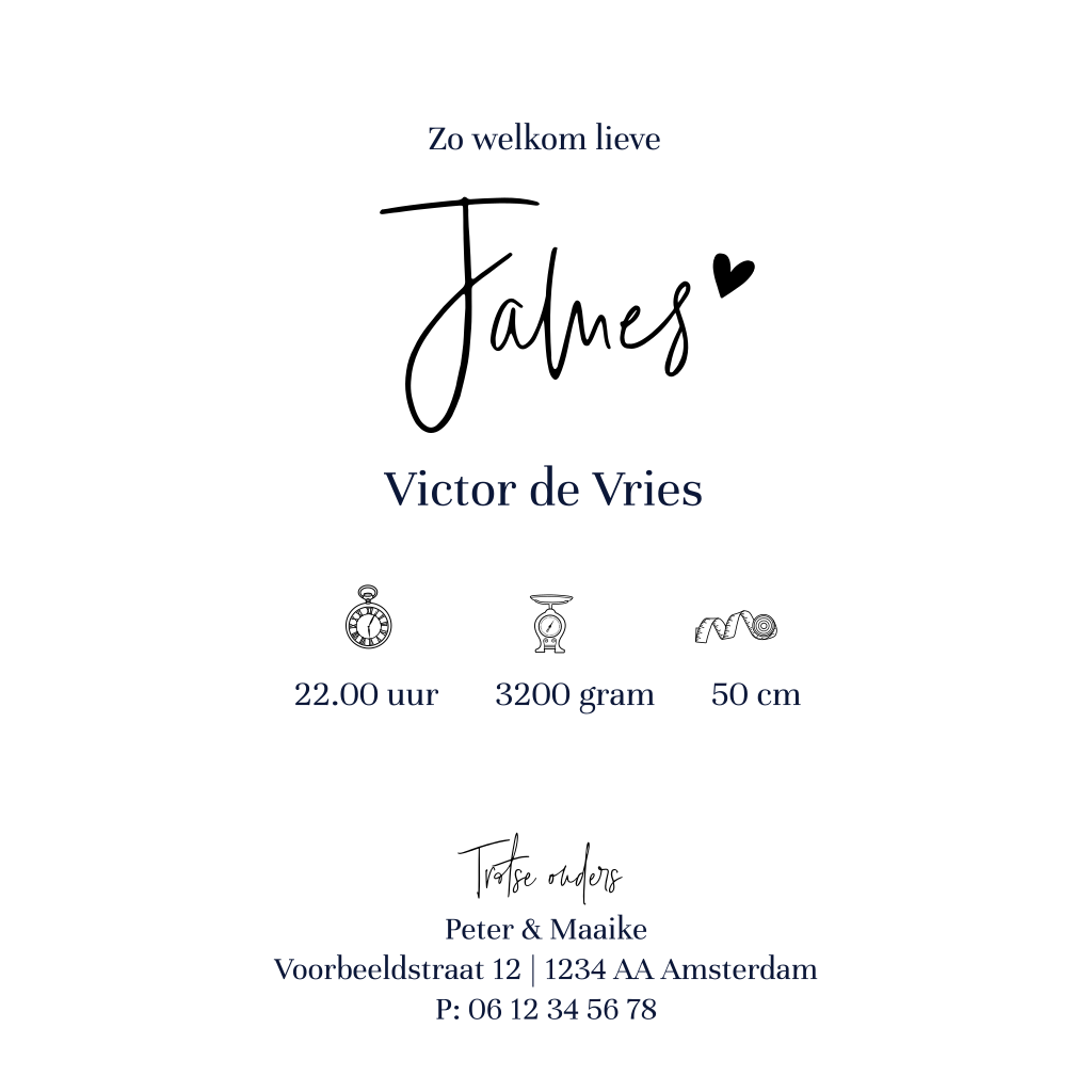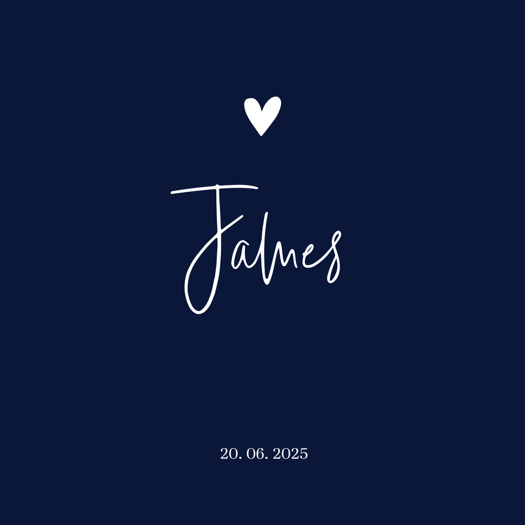 Schattig en stijlvol geboortekaartje voor je zoon met een goudfolie hartje op een donkerblauwe achtergrond. Echt een chique kleurcombinatie!