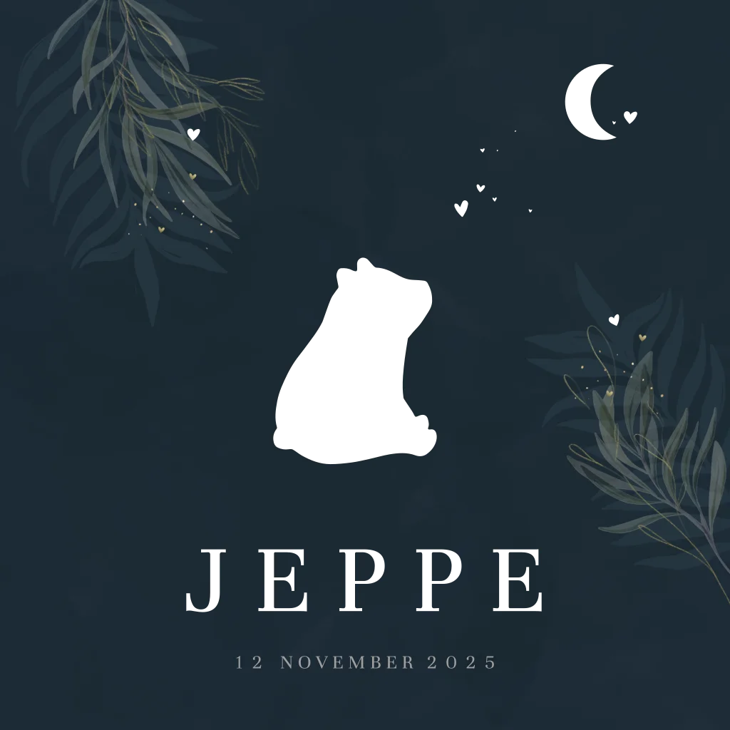 Kondig de geboorte van jullie kleintje aan met dit stoere kaartje. Centraal op het kaartje staat een silhouet van een beertje gedrukt in goudfolie. Ook de maan, naam en kleine hartjes worden gedrukt in goudfolie en geven dit kaartje een luxe uitstraling. Pas het kaartje naar wens aan in onze online editor en bestel snel een proefdruk om dit kaartje in het echt te zien!