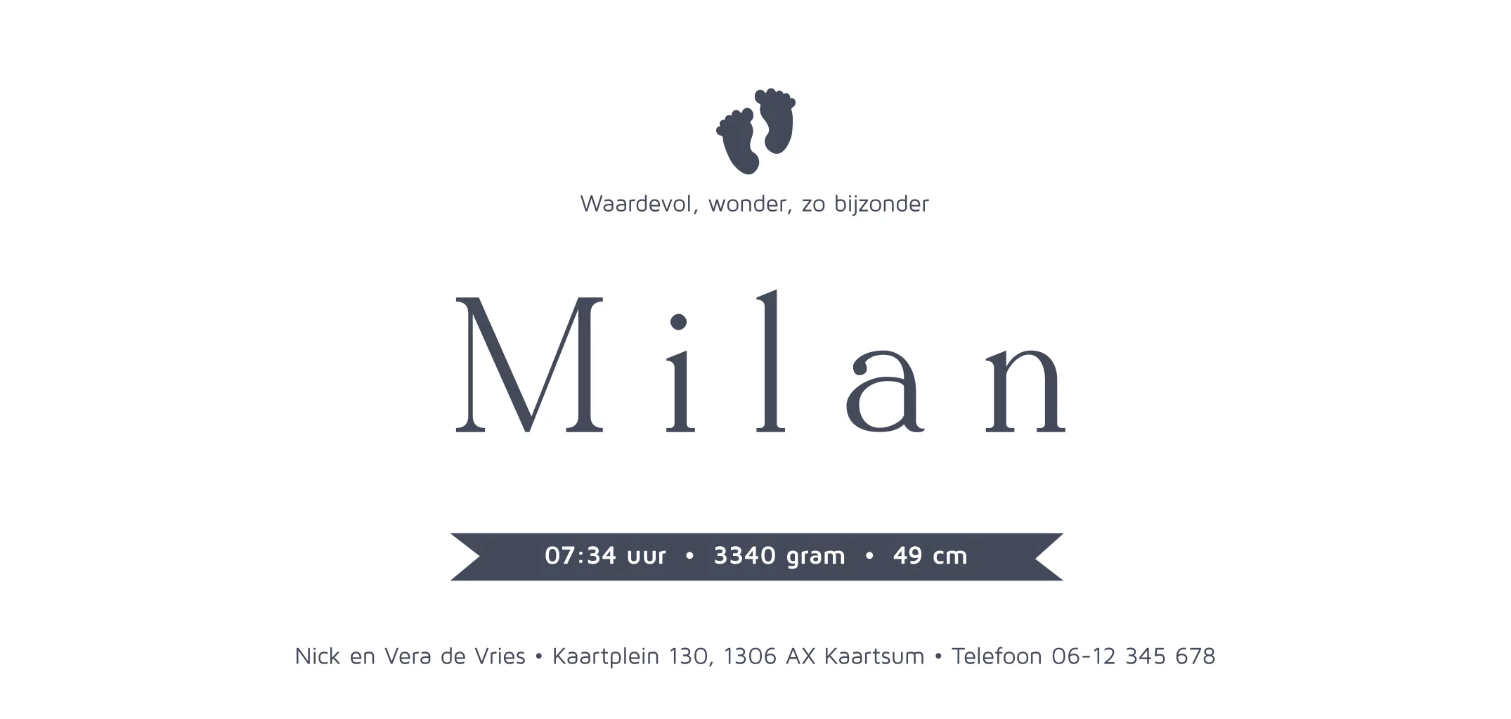 Klassiek geboortekaartje voor je pasgeboren zoon met goudfolie babyvoetjes op een donkerblauwe achtergrond. Liever zilverfolie of koperfolie? Pas het eenvoudig zelf aan in de online editor!