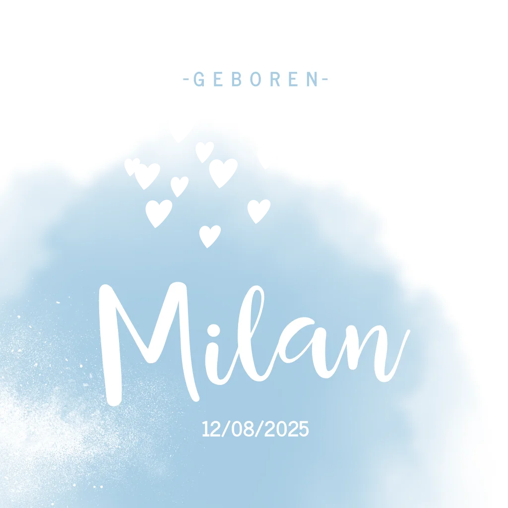Schattig geboortekaartje voor de geboorte van je zoontje met een blauwe watercolour wolk en hippe goudfolie hartjes.