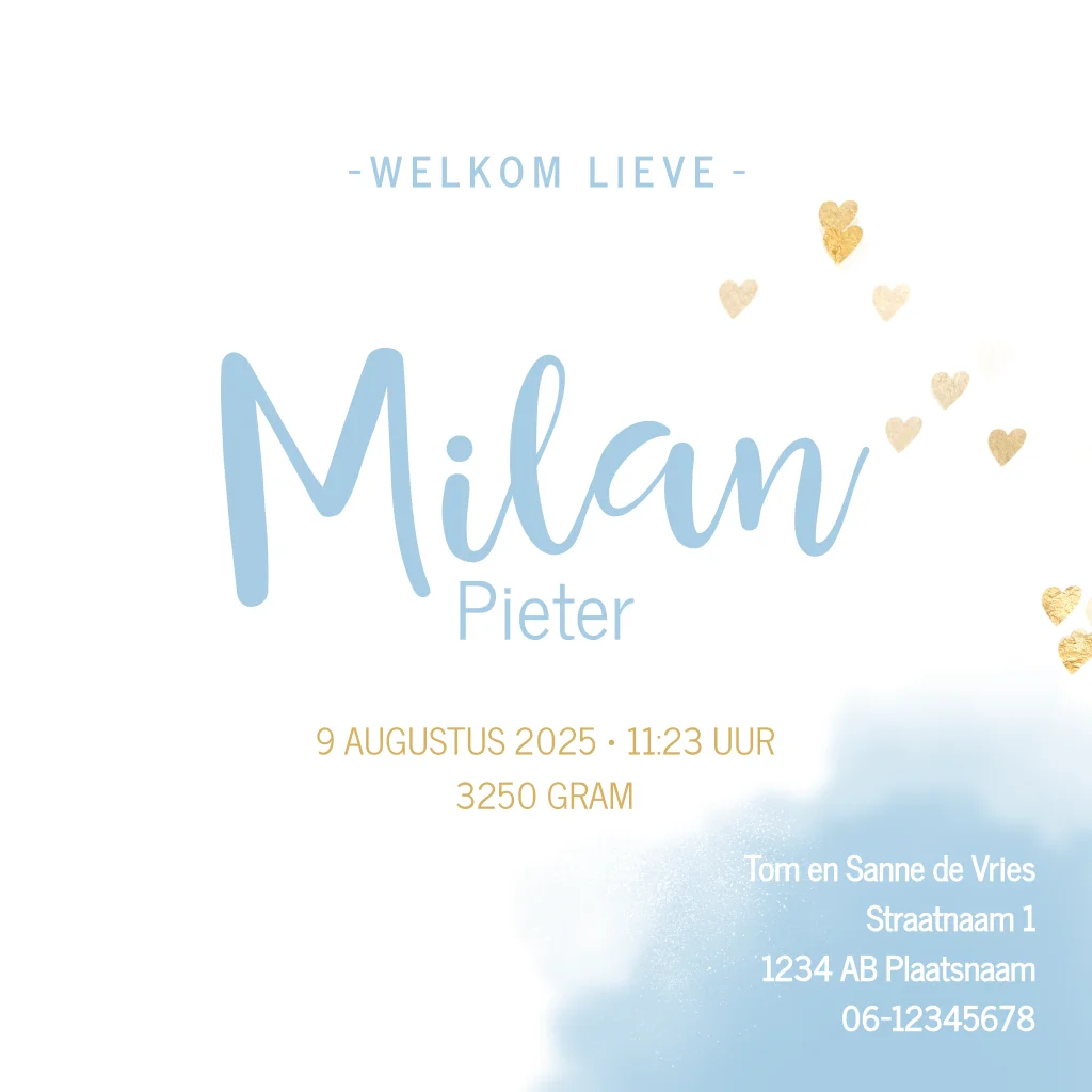 Lief geboortekaartje jongen met blauwe watercolor en goudfolie hartjes