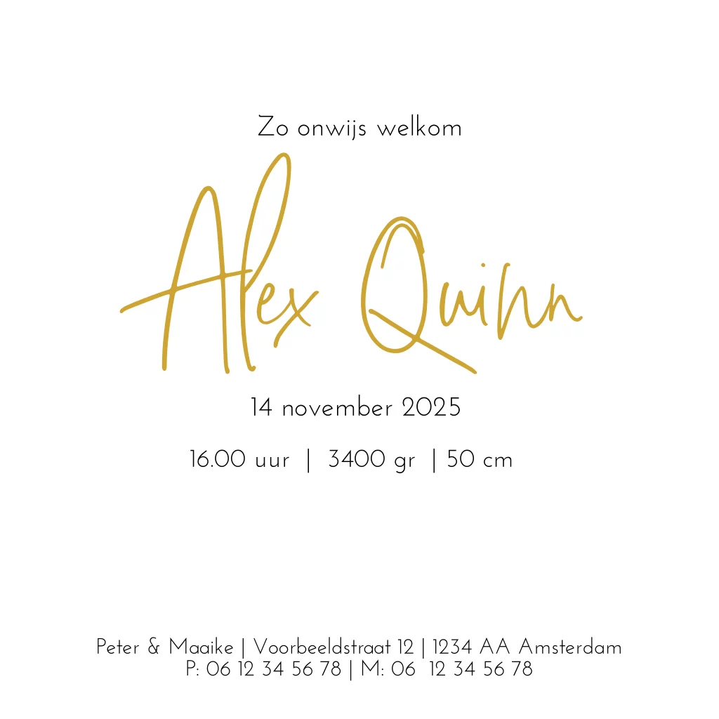 Geboortekaartje voor een jongen of meisje met goudfolie op de voorzijde van de kaart. Dit minimalistische design is helemaal de trend van dit moment. Pas het kaartje geheel naar wens aan. Wist je dat je zelfs de folie naar koper of zilver kunt wijzigen? Ga op de naam staan en verander bij de kleur de soort folie.