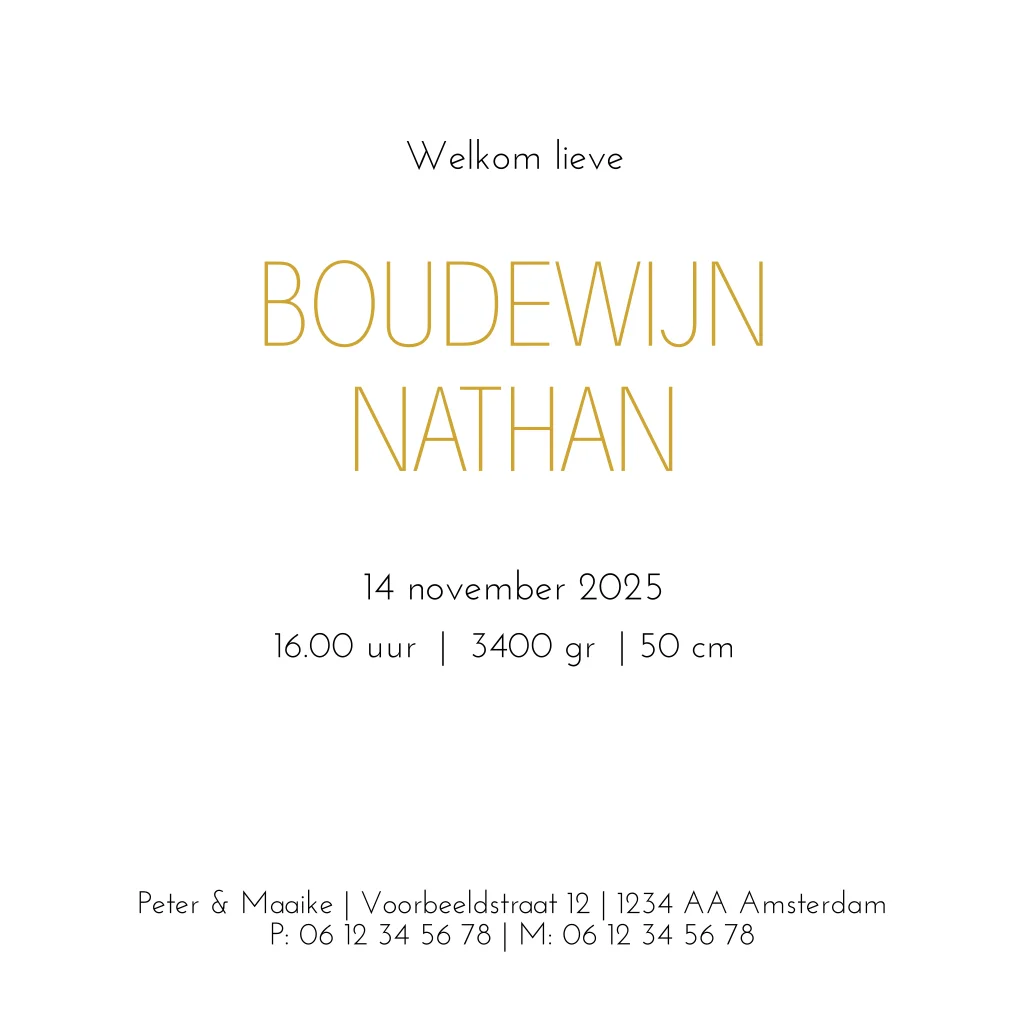 Stoer en klassiek geboortekaartje voor een jongen. De naam op de voorzijde is in goudfolie. Wist je dat je ook de kleur folie kunt aanpassen naar koper of zilver? Je verandert dit makkelijk als je de kleur wijzigt bij de naam.
