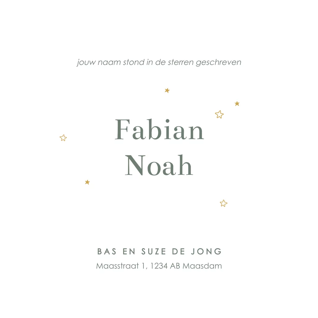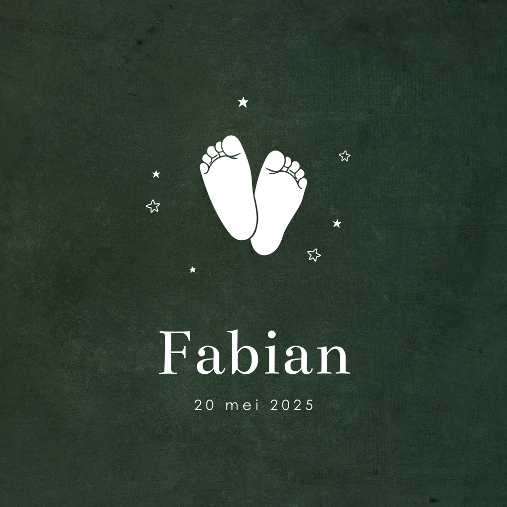 Een klassiek geboortekaartje voor een jongen met goudfolie voetjes. De achtergrond is stoer door de groene kleur en de structuur. Om de voetjes heen zien je kleine sterretjes. In onze online editor kan je dit ontwerp gemakkelijk aanpassen.