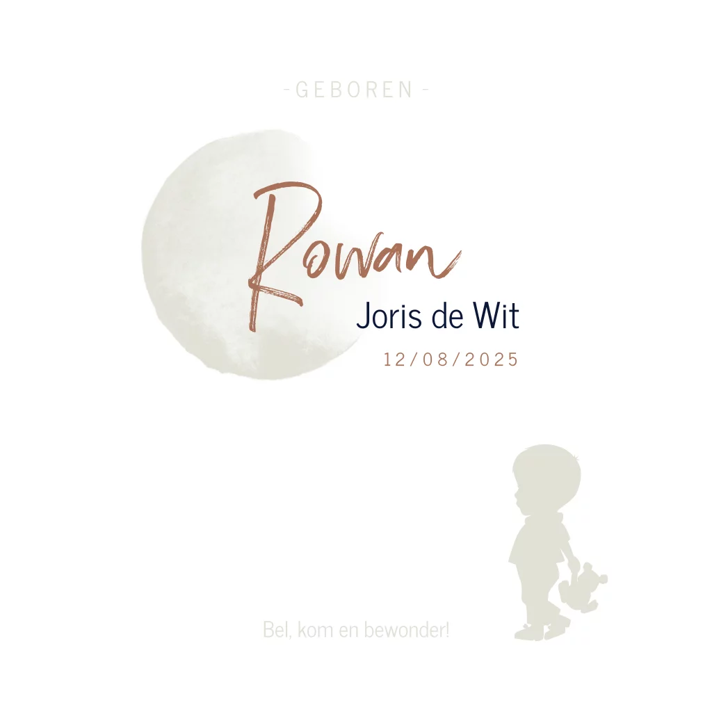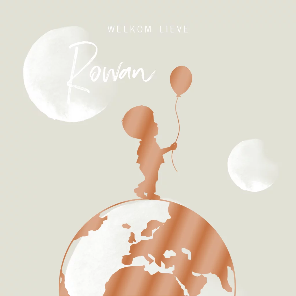 Origineel geboortekaartje voor je pasgeboren zoon die helemaal past in de huidige trends. Met een hip hoogglans silhouet van een jongetje met een ballon die op de wereld staat. De zacht grijze achtergrond met een maan maakt dit geboortekaartje helemaal af!