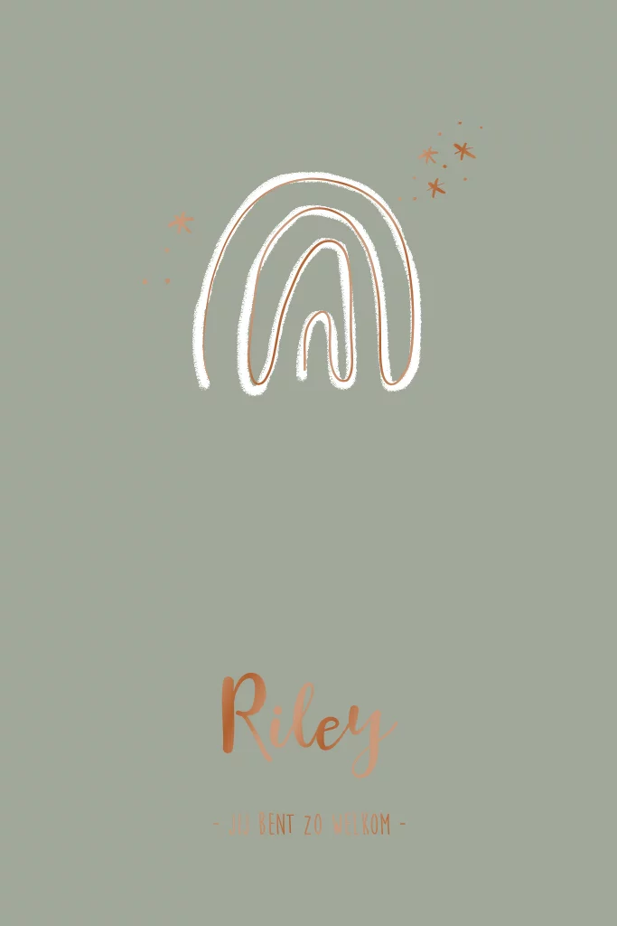 Uniek geboortekaartje met hoogglans voor je zoon met een trendy lijntekening van een regenboog en sterretjes op een groene achtergrond.