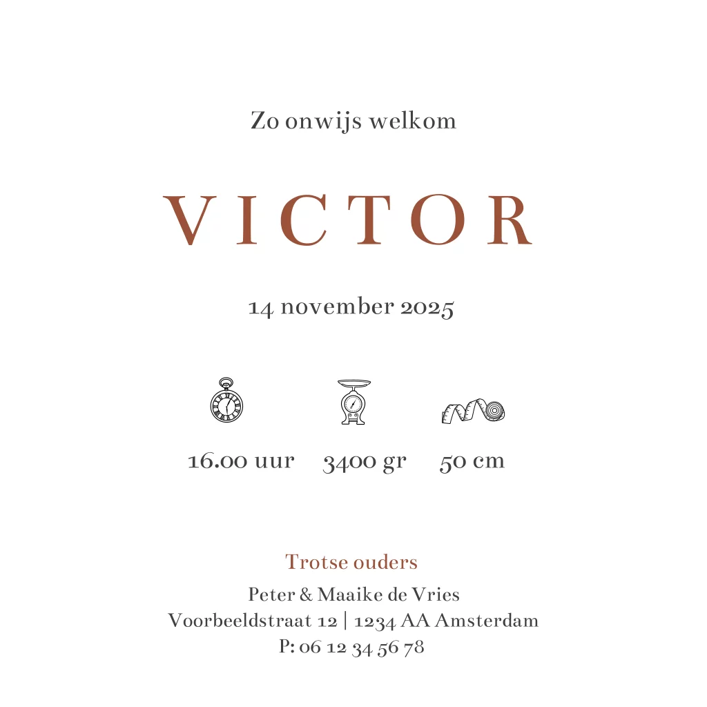 Goed om te weten: Het houten vormpje wordt niet standaard meegeleverd, dit kun je gemakkelijk zelf toevoegen tijdens het bestelproces. Je vindt alle bevestigingsmaterialen hier. Wanneer je de geboortekaartjes ontvangt, kun je het kaartje zelf verrijken met het gekozen houten vormpje.