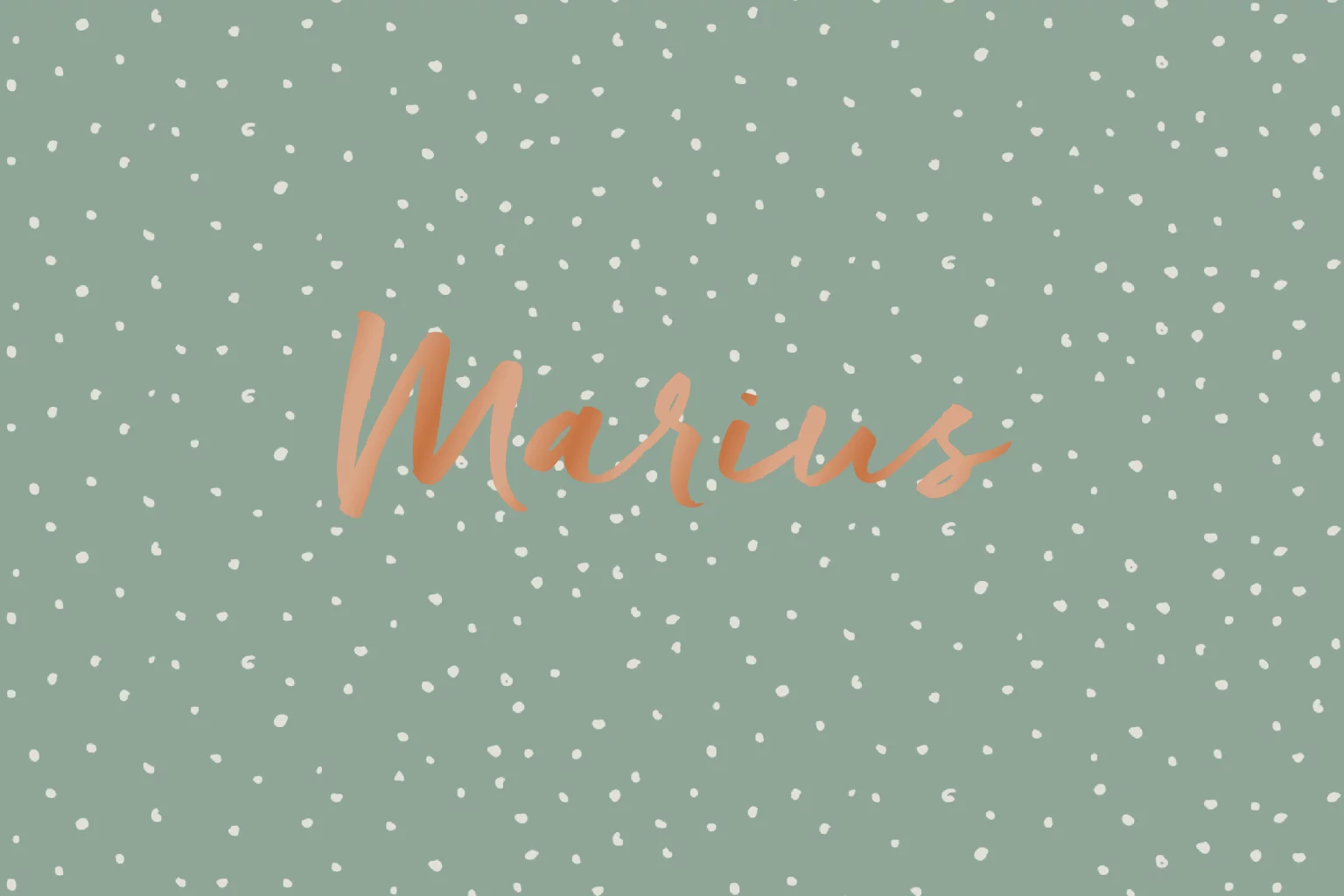 Uniek geboortekaartje voor je pasgeboren zoontje met hippe stipjes op groen en de babynaam in hoogglans druk.