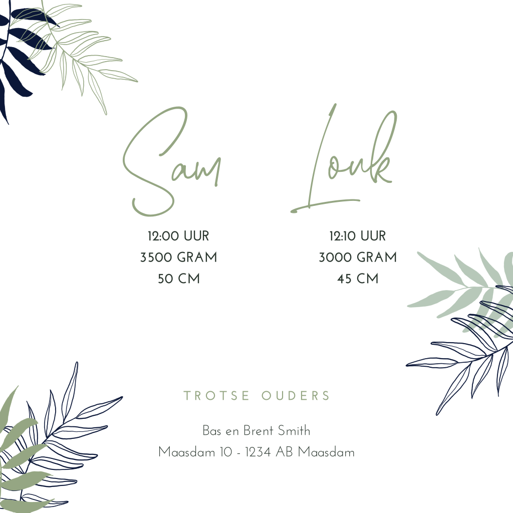 Een stoer jungle geboortekaartje voor een tweeling. Op het kaartje zie je twee giraffes gedrukt in goudfolie. Daarnaast heeft het ontwerp verschillende junglebladeren en een sierlijk lettertype. Pas dit kaartje voor jouw tweeling aan in onze online editor.