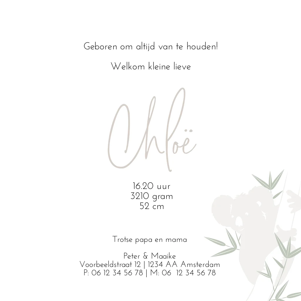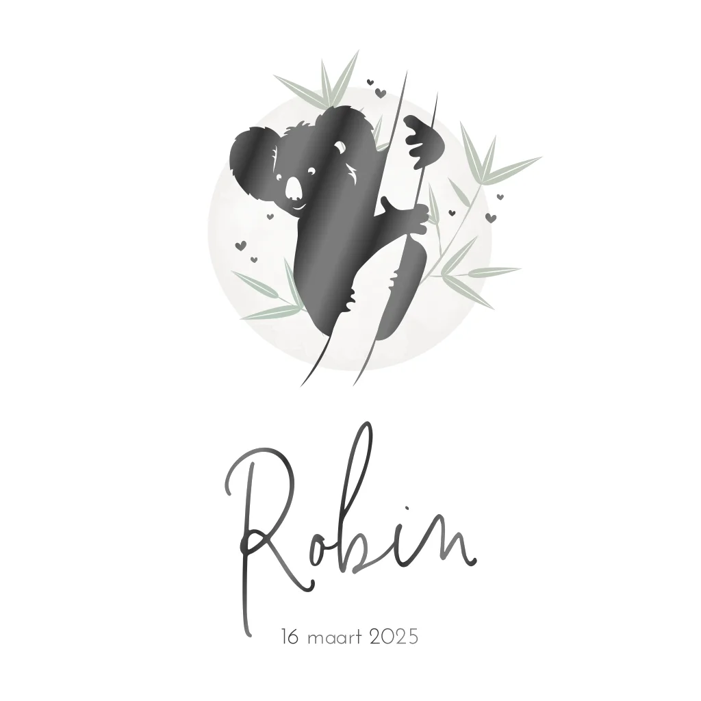 Stoer geboortekaartje met zwart folie voor je pasgeboren zoontje of dochtertje. De illustratie van een koala in zwart folie maakt deze kaart erg hip. Het staat ook erg mooi in contrast met de cleane witte achtergrond.