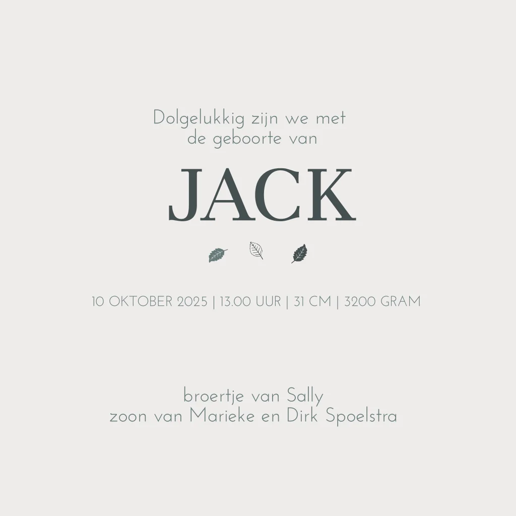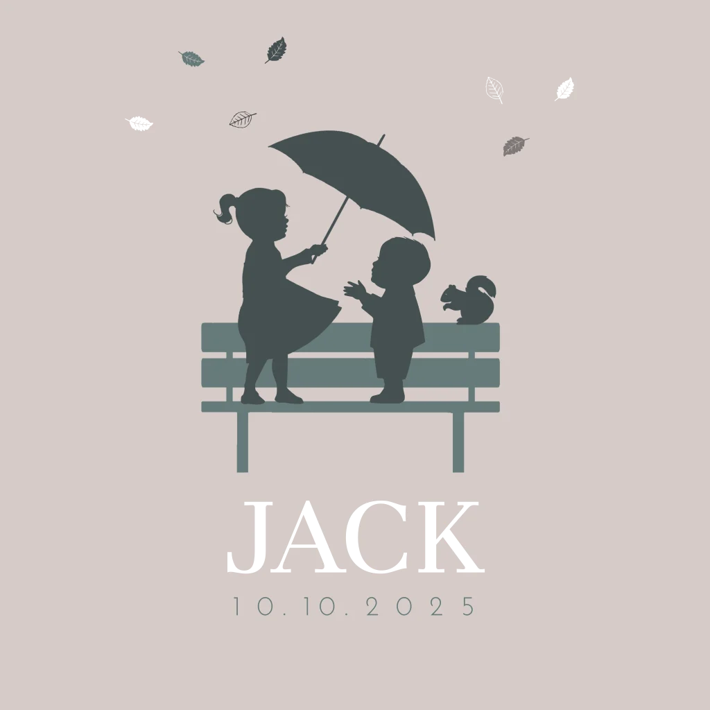 Een hippe babykaart voor een jongen, met een broertje en zusje op een bankje. De naam en een aantal blaadjes staan in zwart folie.