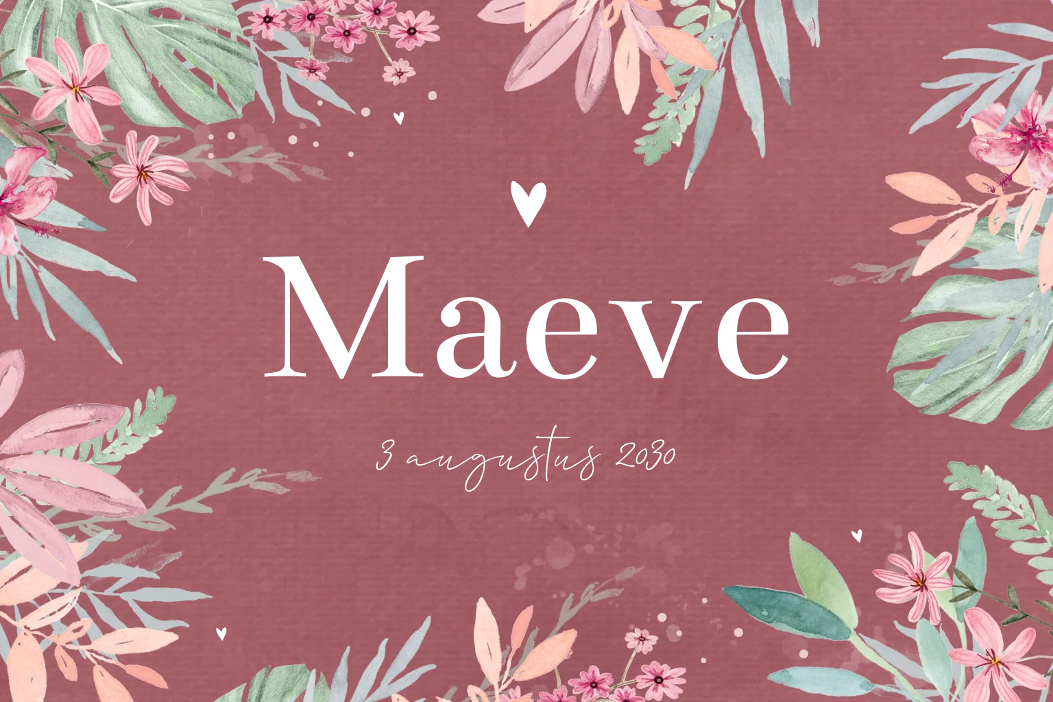 Botanisch geboortekaartje met roséfolie naam. De bloemen en de roze trendkleur vormen een prachtig geheel. Pas het kaartje naar wens aan en bestel een proefdruk om jouw ontwerp in het echt te bewonderen.