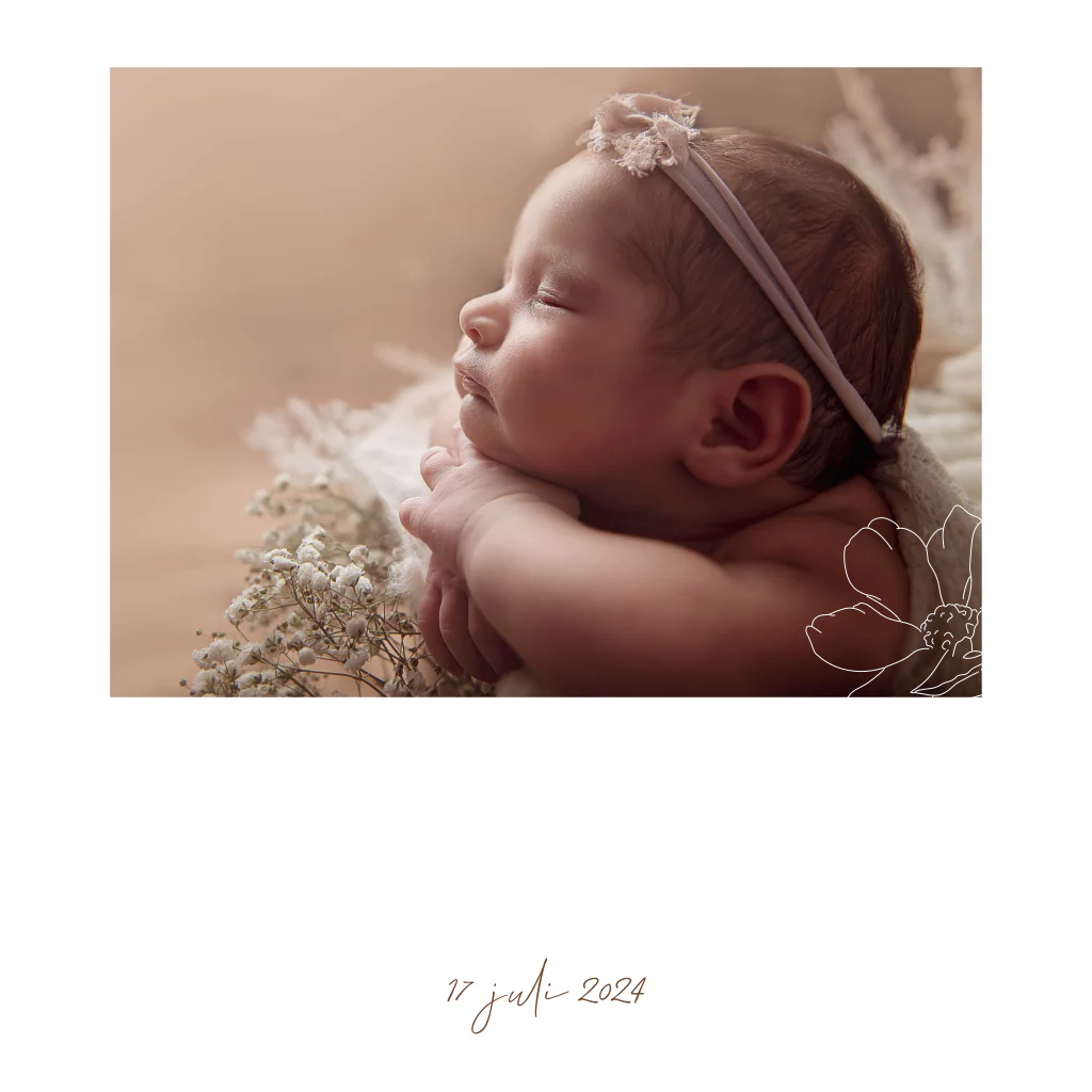 Lief geboortekaartje met een persoonlijke foto van jullie dochtertje. De naam van jullie kleintje en de lijntekening van een bloem zijn gedrukt in roségoudfolie. Door een foto van jullie dochtertje wordt dit een origineel en bijzonder geboortekaartje.