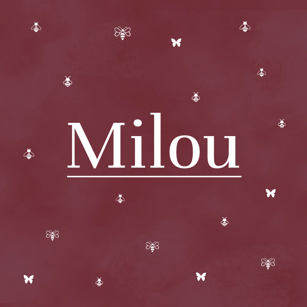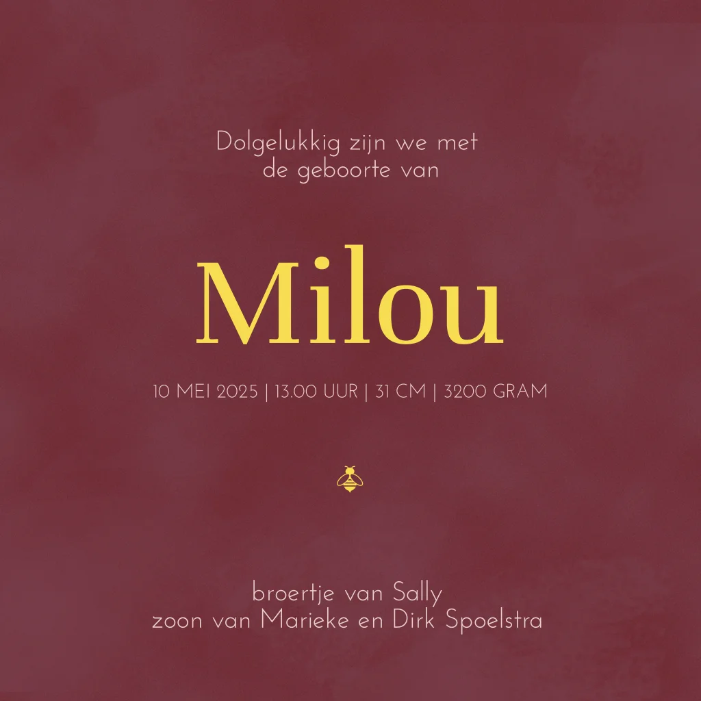 Op dit trendy geboortekaartje staan de naam van je dochter en een patroon van vlinders en bijtjes gedrukt in goudfolie. Het kaartje heeft een mooi strak ontwerp en een hippe velvet-look achtergrond in donkerrood.