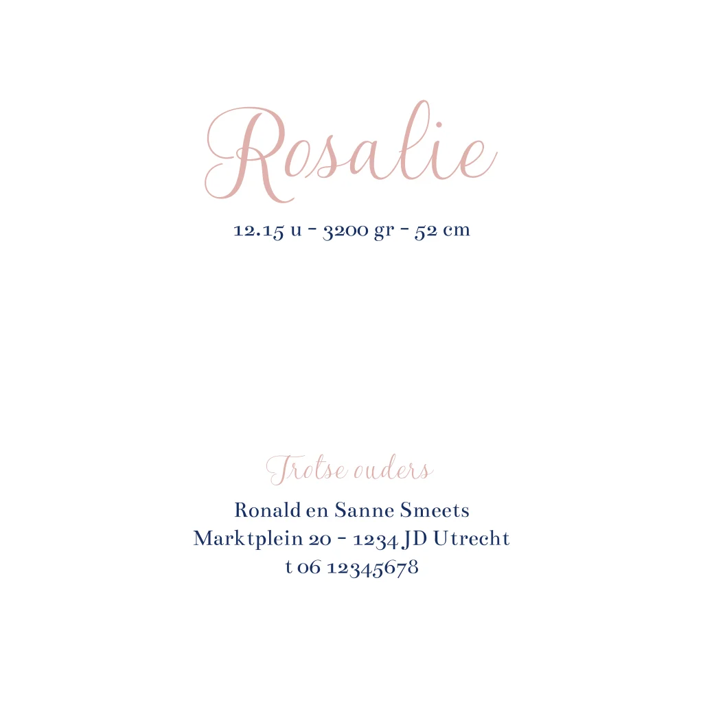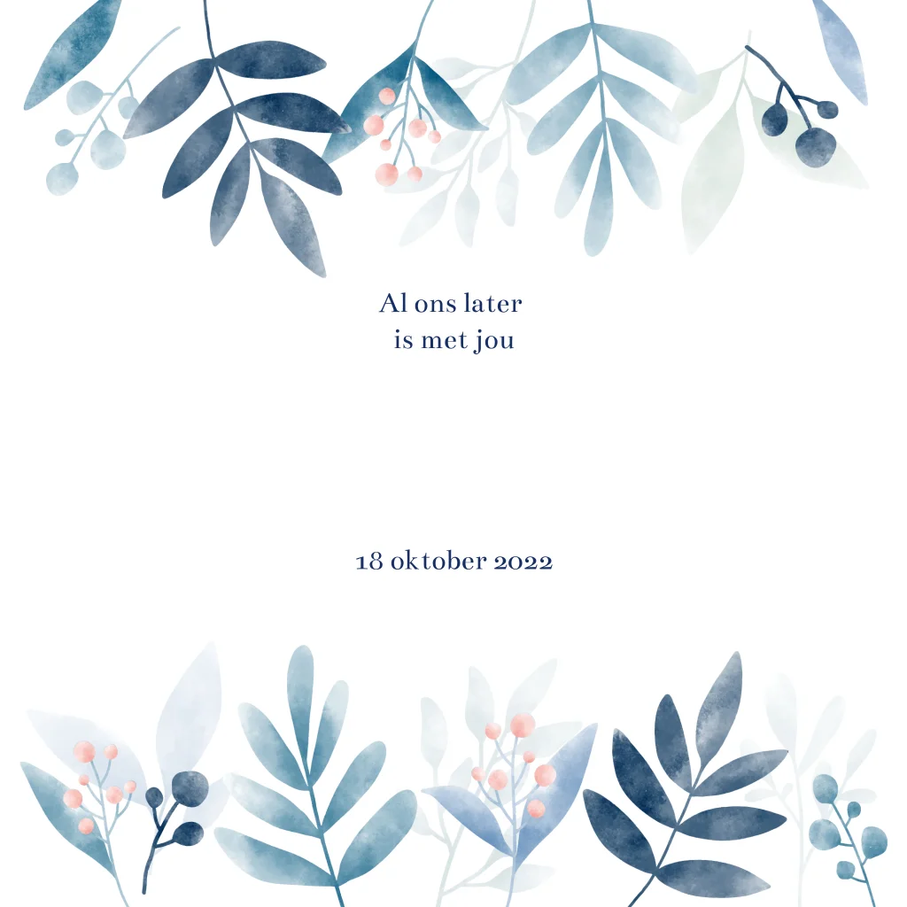 Schattig geboortekaartje met geschilderde bloemen in blauwtinten. De naam van jullie dochtertje wordt in roségoudfolie gedrukt. Het kaartje kan naar wens aangepast worden in de online editor.