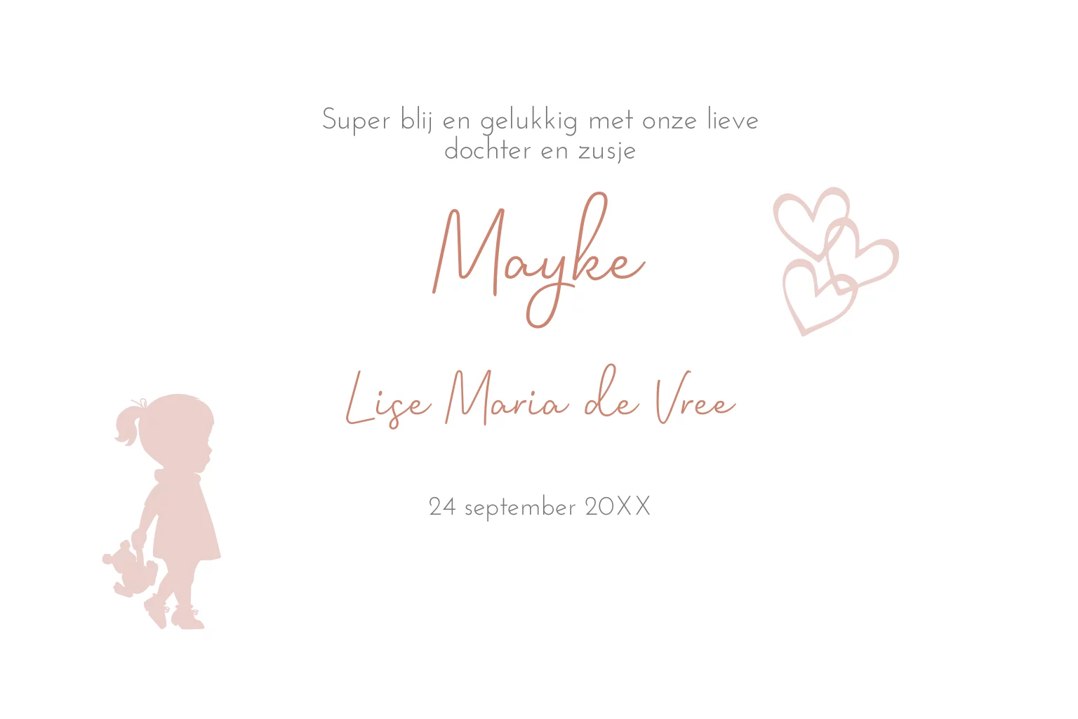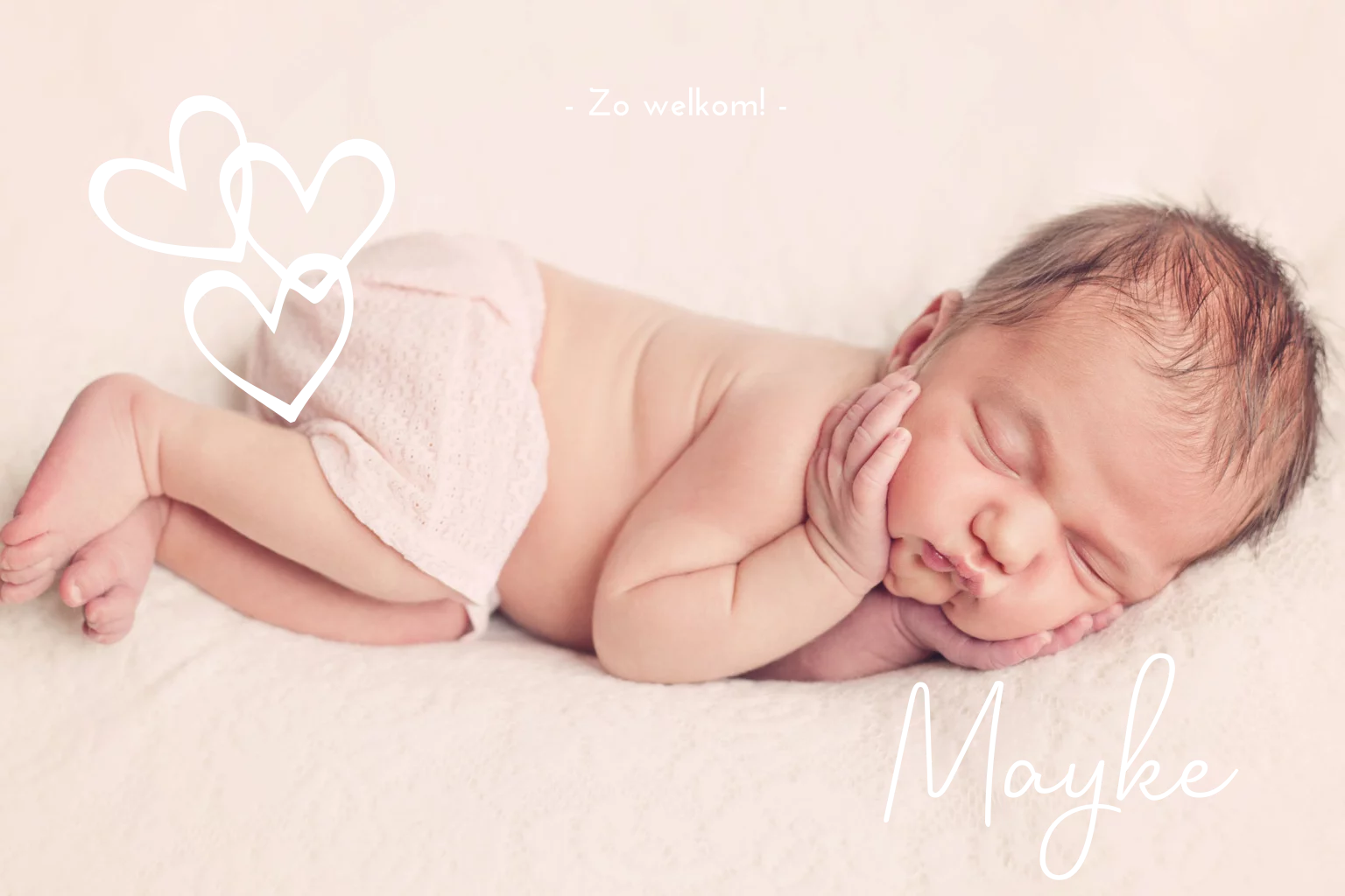 Een lief geboortekaartje met de mooiste foto van je kleintje met de naam en drie hartjes in foliedruk. Liever goud-, holografisch- of zilverfolie, deze kun je gemakkelijk aanpassen bij de kleur.