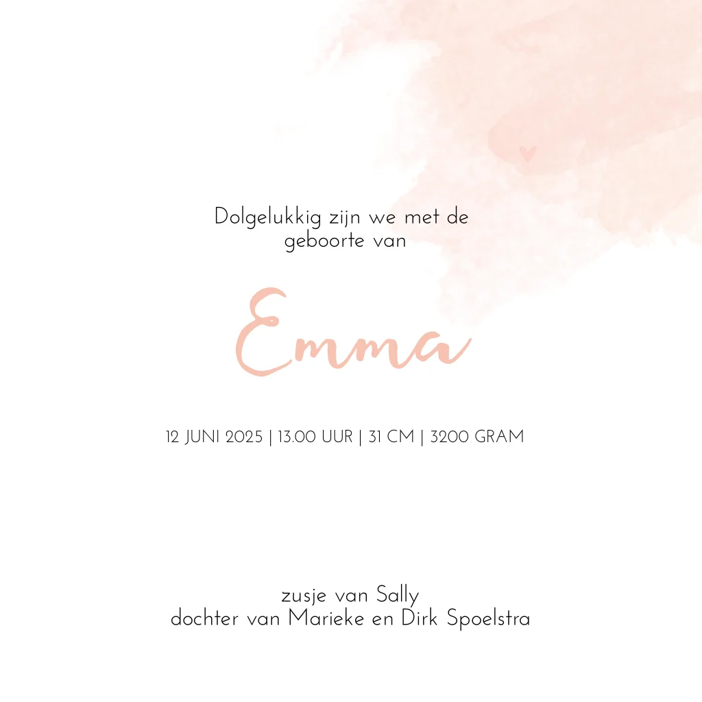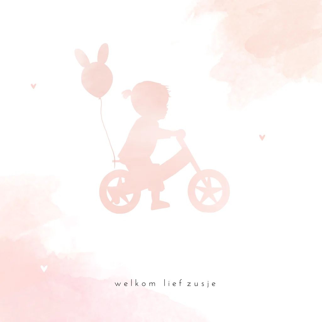 Lief geboortekaartje met het silhouet van een meisje met trapfiets en ballon. De naam van je kindje en een aantal hartjes worden gedrukt in roségoudfolie. Het kaartje kan je naar eigen wens aanpassen in de online editor.