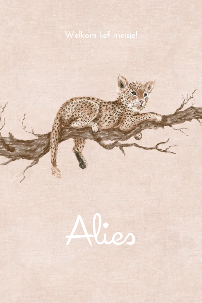 Dit is een stoer geboortekaartje voor een meisje. Een kleine getekende panter ligt op een tak. Het kaartje heeft een roze velvet-look achtergrond en roségoudfolie typografie. Pas het kaartje naar wens aan in de online editor.