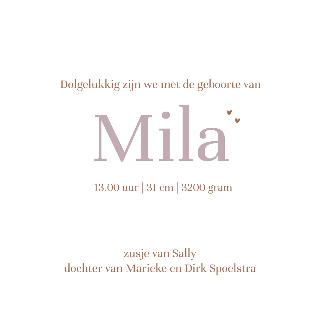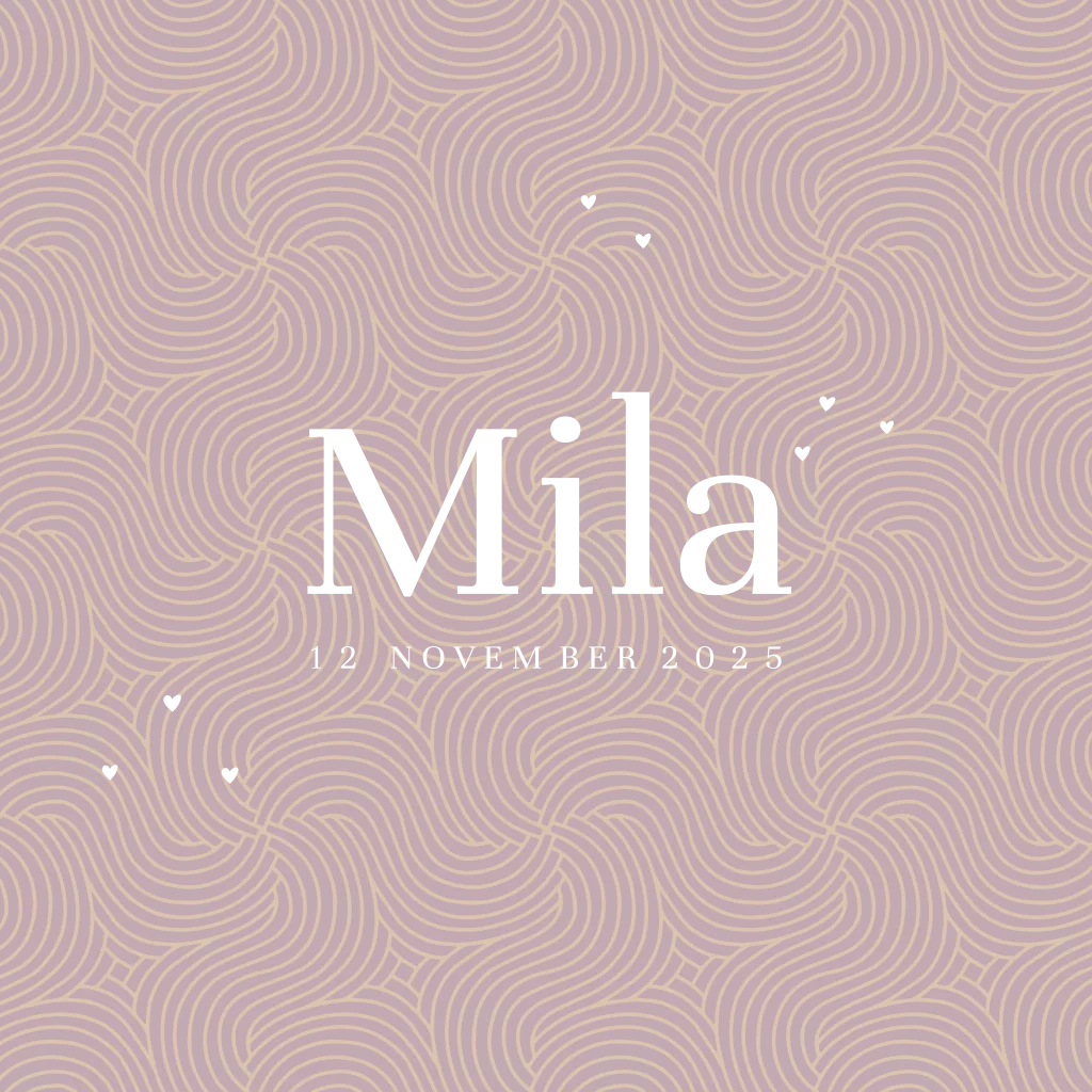 Dit is een prachtig origineel kaartje voor de geboorte van jullie dochtertje. De naam, geboortedatum en hartjes worden gedrukt in roségoudfolie en dit sluit mooi aan bij de lila achtergrond. Bestel snel een proefdruk om dit kaartje in het echt te zien!