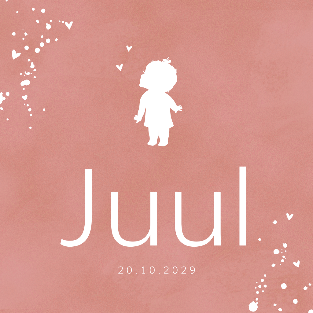 Op dit lieve geboortekaartje staat het silhouet van een meisje dat hartjes blaast naar boven. De roze velvet-look achtergrond in combinatie met de roségoudfolie typografie en details is prachtig. Bestel snel een proefdruk om dit kaartje in het echt te zien!