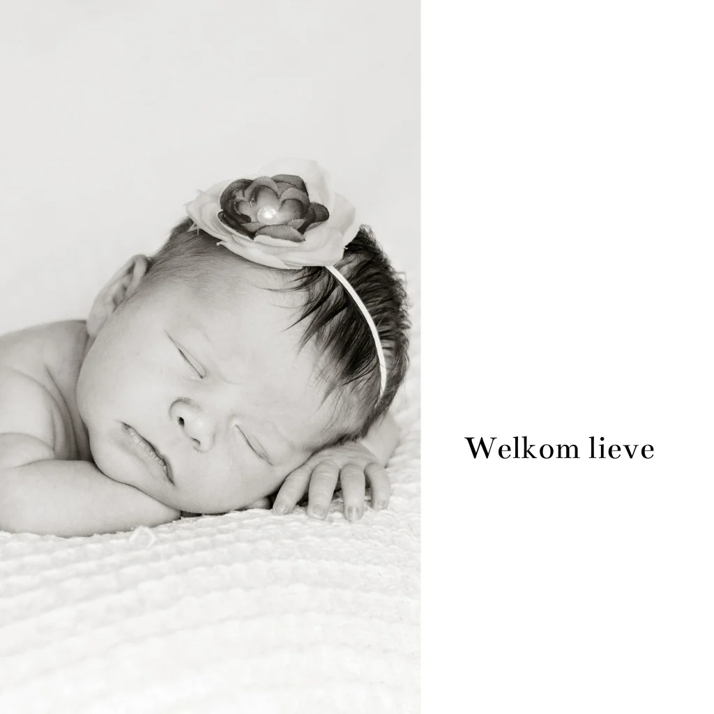 Vierkant geboortekaartje met een persoonlijke foto op de voorkant en de tekst in goudfolie. Leuk voor een meisje! Dit trendy zelf maken kaartje is naar wens op te maken in onze online editor. Maak hem zelf af!
