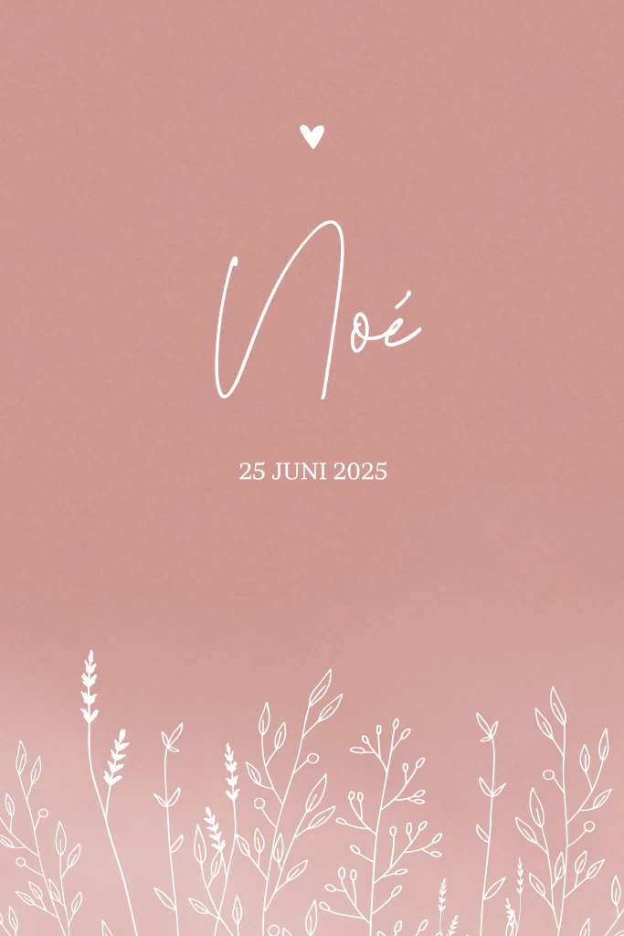 Trendy kaartje voor een dochtertje met bloemen in goudfolie op een oudroze achtergrond. De naam van jullie kleine meid wordt in een sierlijk lettertype geschreven. Boven de naam staat een klein lief hartje en eronder staat de geboortedatum.