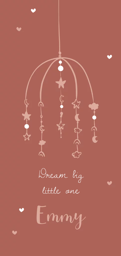De mobiel op deze lieve kaart heeft kleine sterretjes, maantjes en regenboogjes. Ontzettend leuk voor jullie dochter! De oud roze achtergrond zorgt voor een mooi contrast met de illustratie. De goudfolie details maken het helemaal af.