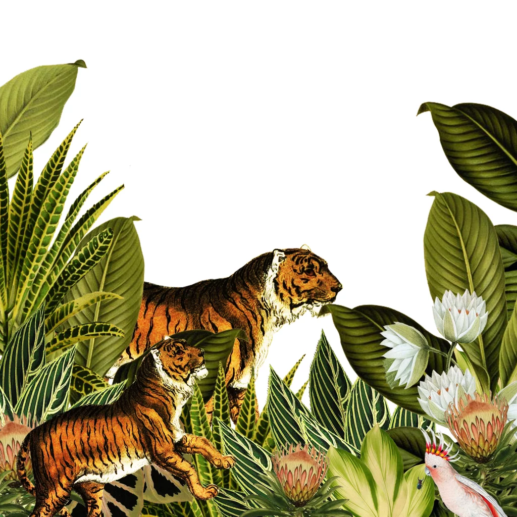 Origineel geboortekaartje voor je dochter of zoon met twee tijgers tussen botanische jungle planten en mooie papegaaien. De goudfolie op de voorkant maakt dit kaartje helemaal af!