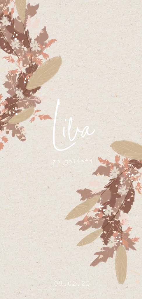 Trendy geboortekaartje met goudfolie voor je pasgeboren dochter met stijlvolle geschilderde droogbloemen op een achtergrond met kraftlook in een natuurlijke tint.