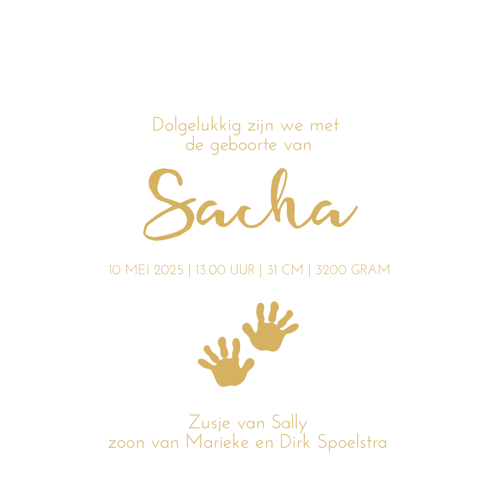 Schattig geboortekaartje met twee lieve baby voetjes in goudfolie op een witte achtergrond. Echt een hip geboortekaartje voor een jongen of een meisje. Supermooi met papiersoort Oud-Hollands! Liever een andere achtergrondkleur? Pas het eenvoudig aan in de online editor.