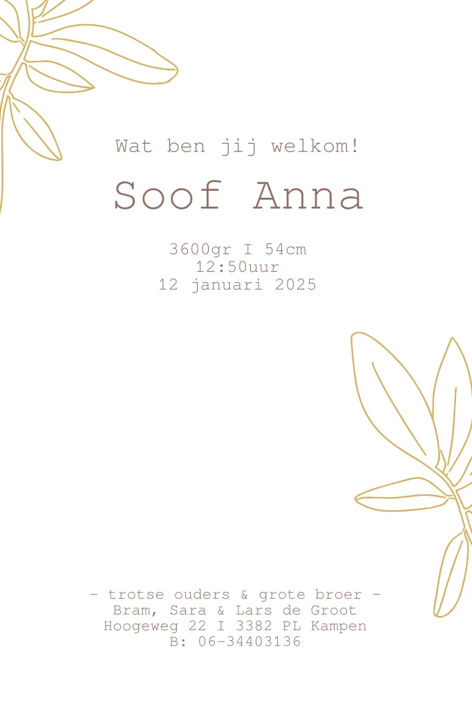 Botanisch geboortekaartje met goudfolie takjes en foto voor de geboorte van een meisje. Pas zelf de kleur van het folie aan naar koperfolie of zilverfolie en maak zo een origineel geboortekaartje!