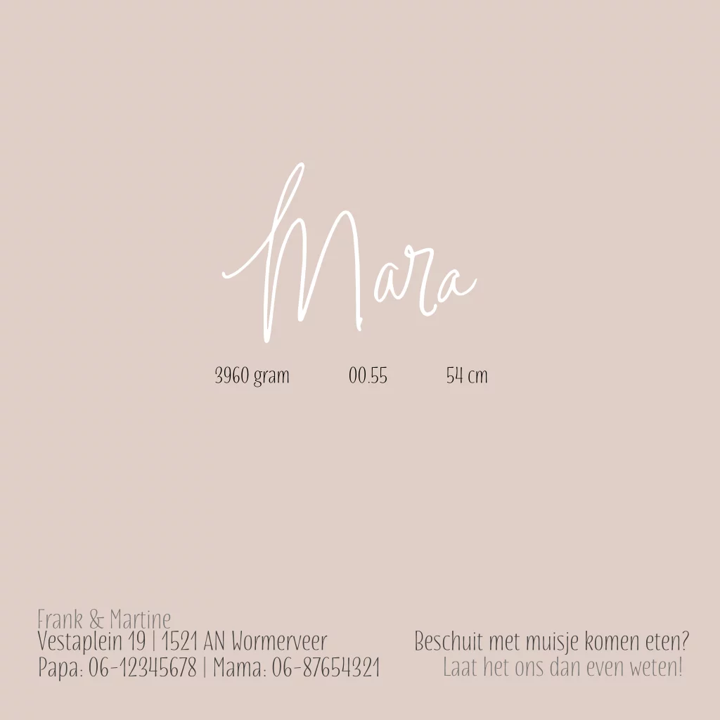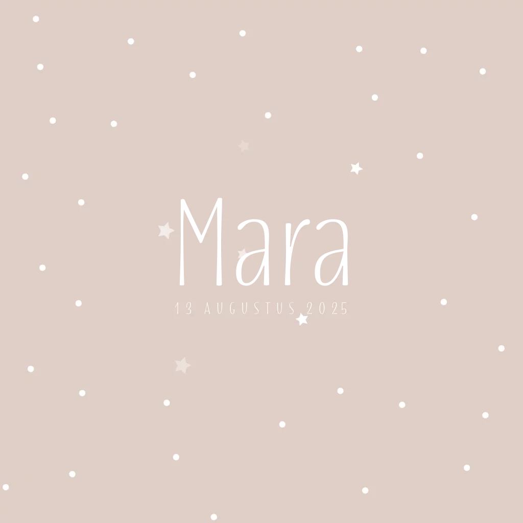 Schattig geboortekaartje voor je dochtertje met de babynaam in goudfolie op een oudroze achtergrond met witte stipjes en sterretjes.