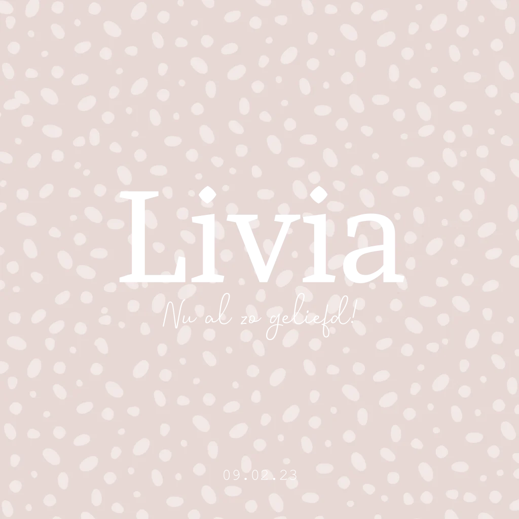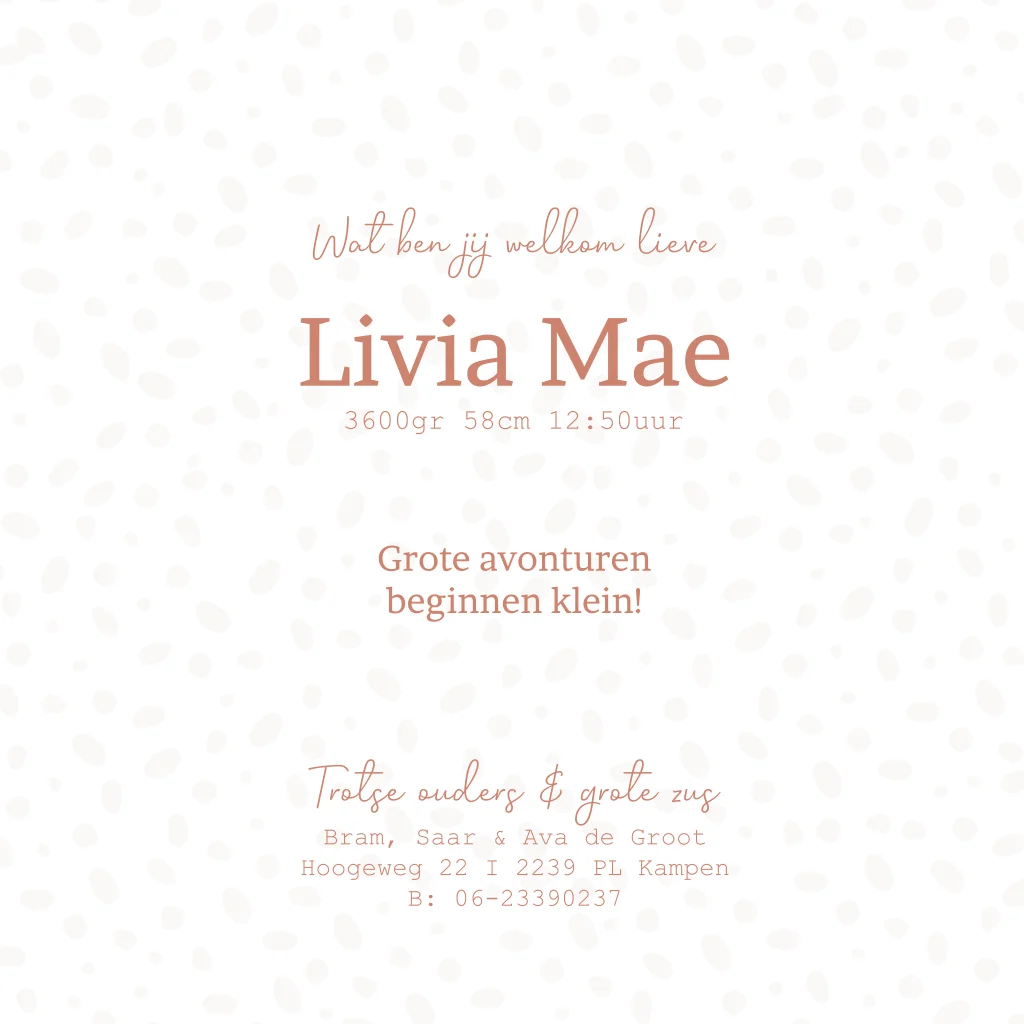 Dit hippe geboortekaartje voor een meisje kun je zelf aanpassen naar wens. De stipjes, de roze achtergrondkleur en de tekst in folie kun je in de online editor gemakkelijk een andere kleur geven.