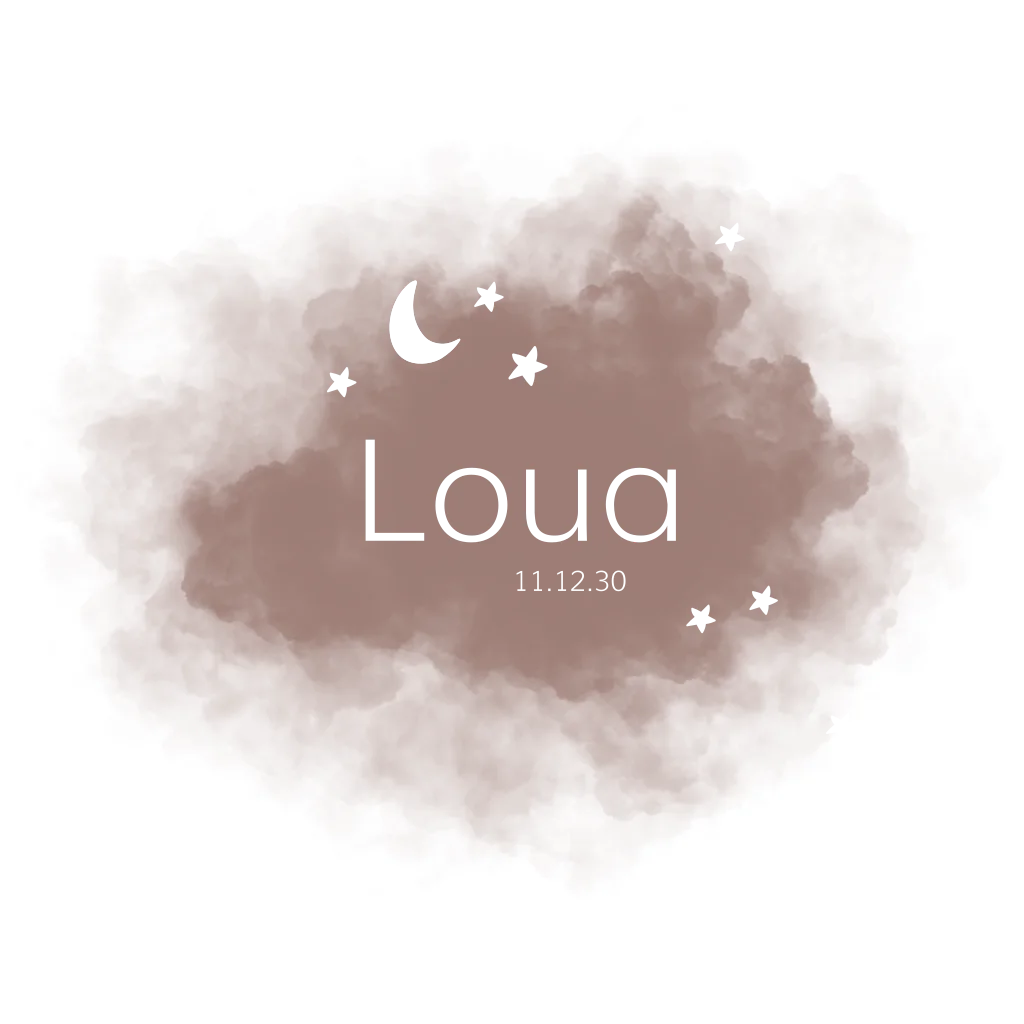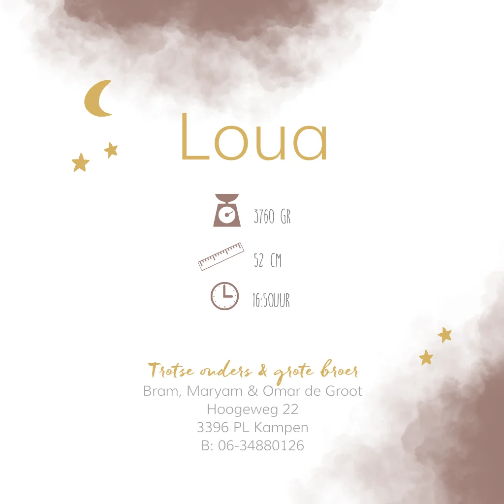 Stoer geboortekaartje voor je dochtertje met een roestbruine wolk van aquarel verf met daarop goudfolie sterren en een maan. Verander de kleuren, lettertypes en schrijf je eigen tekst om dit geboortekaartje uniek te maken!