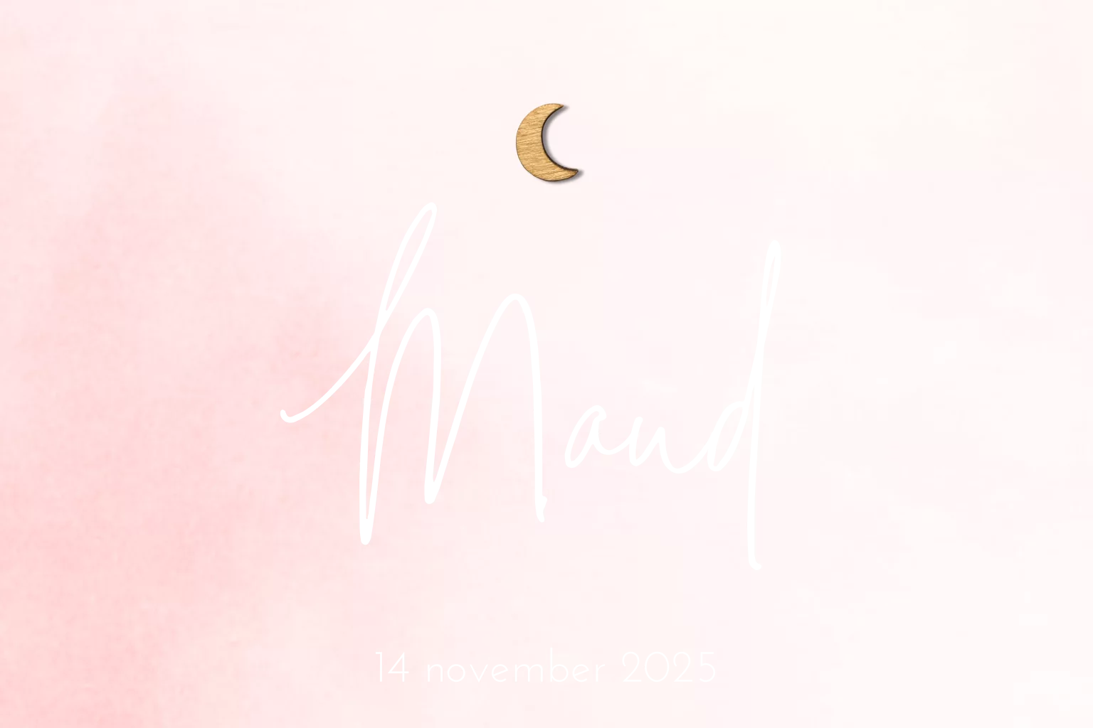 Trendy geboortekaartje voor je dochter met goudfolie en echt houten maantje op een hippe roze aquarelverf achtergrond.